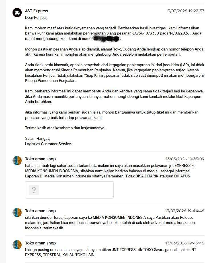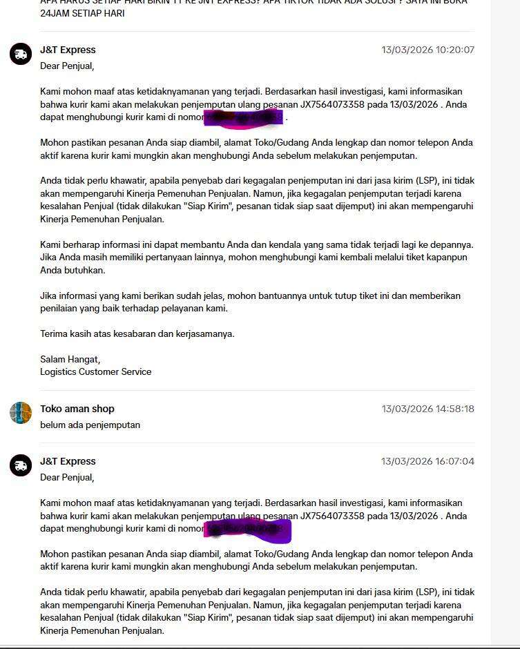 - Kami juga sebagai pihak toko “Terpaksa” menggunakan J&T Express, karena pengajuan kami ke TikTok Shop untuk menghapus J&T Express dari TikTok di toko kami selalu gagal. Pihak TikTok Shop hanya menjawab di akhir keputusan: akan melakukan evaluasi, meskipun tidak pernah ada perkembangan karena kami sudah meminta sejak tahun 2025 untuk meminta TikTok menghapus J&T Express dari toko kami (kami tidak meminta untuk toko orang lain).