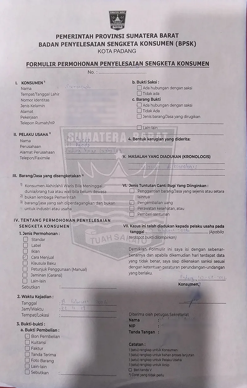 Niat saya hanya ingin mengubah perlakuan pelaku usaha terhadap masyarakat NKRI. Mereka enggan memberikan alamat untuk mengirimkan panggilan dari BPSK Kota Padang. Bayangkan jika mereka melakukan hal ini kepada konsumen setiap hari sebanyak 100 orang, berapa banyak dana fresh money yang mereka peroleh?