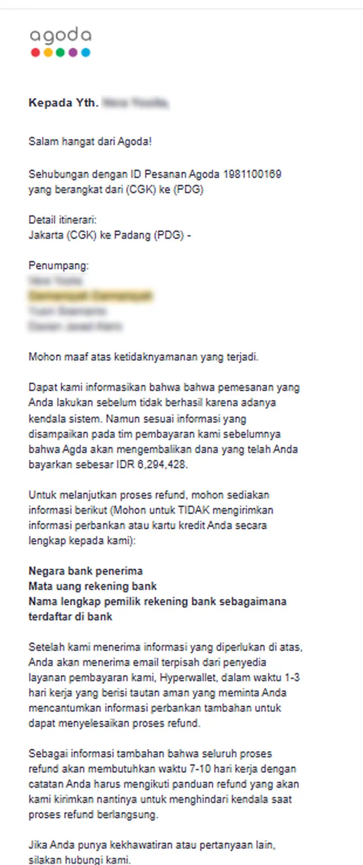 Setibanya di Padang, saya menghubungi CS Agoda dan mereka memberi tahu bahwa uang saya akan dikembalikan dalam waktu 8 – 30 hari. Dalam pikiran saya, sangat tidak adil jika mereka menahan uang dalam jumlah yang cukup besar, padahal ini bukan kesalahan konsumen.