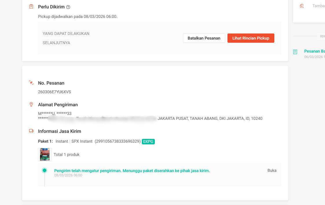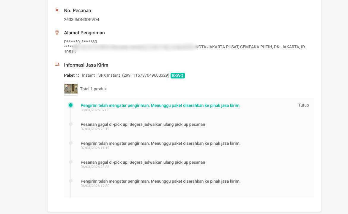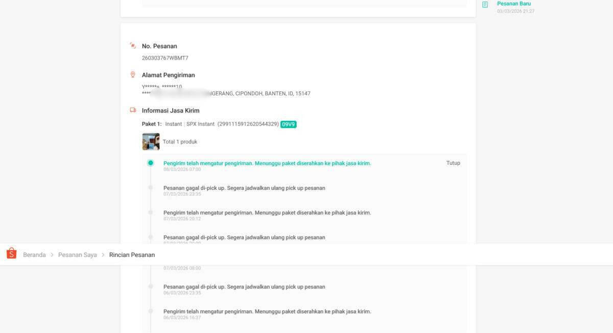 Saya mendapatkan order di Shopee dengan nomor pesanan 260303767WBMT7, nomor pesanan 260306DN3DPVD4, nomor pesanan 260306DV96JJRD, dan nomor pesanan 260306E7YU6XVS. Kami pun sudah membuat laporan di Shopee sebagai berikut.