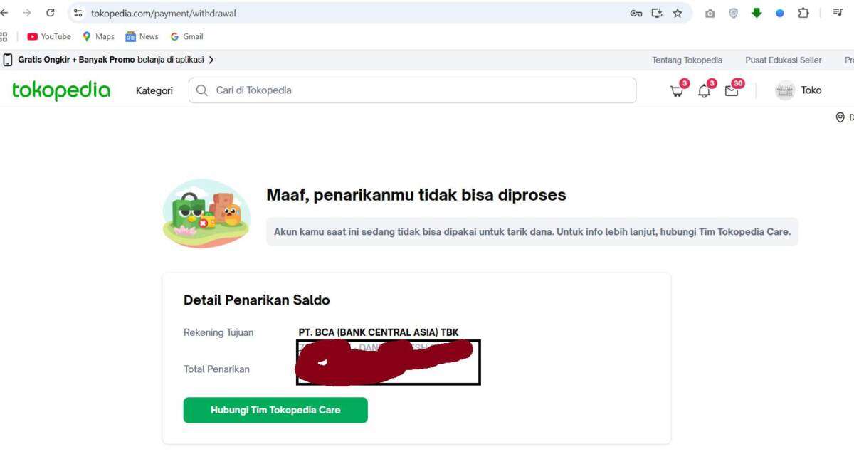 Saya ingin menyampaikan keluhan serius mengenai saldo di akun Tokopedia saya yang tiba-tiba diblokir dan tidak bisa ditarik ke rekening BCA saya. Hingga hari ini, saya tidak mendapat penjelasan apa pun dari pihak Tokopedia.