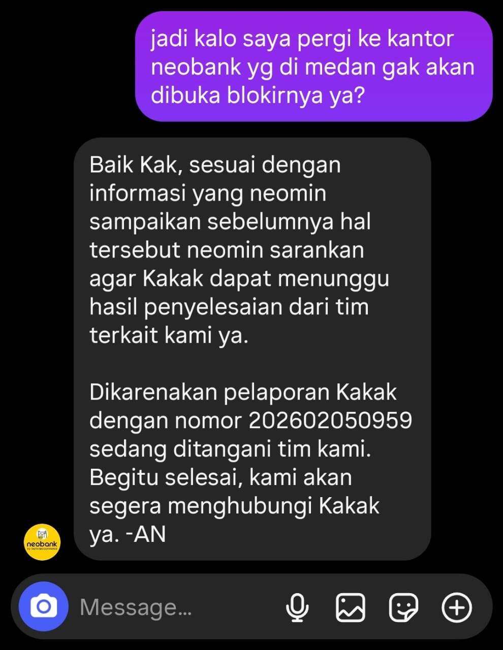 Saya sudah mengajukan pengaduan resmi dengan nomor 202602050959. Namun hingga saat ini, belum ada kejelasan apa pun dari pihak Bank Neo.