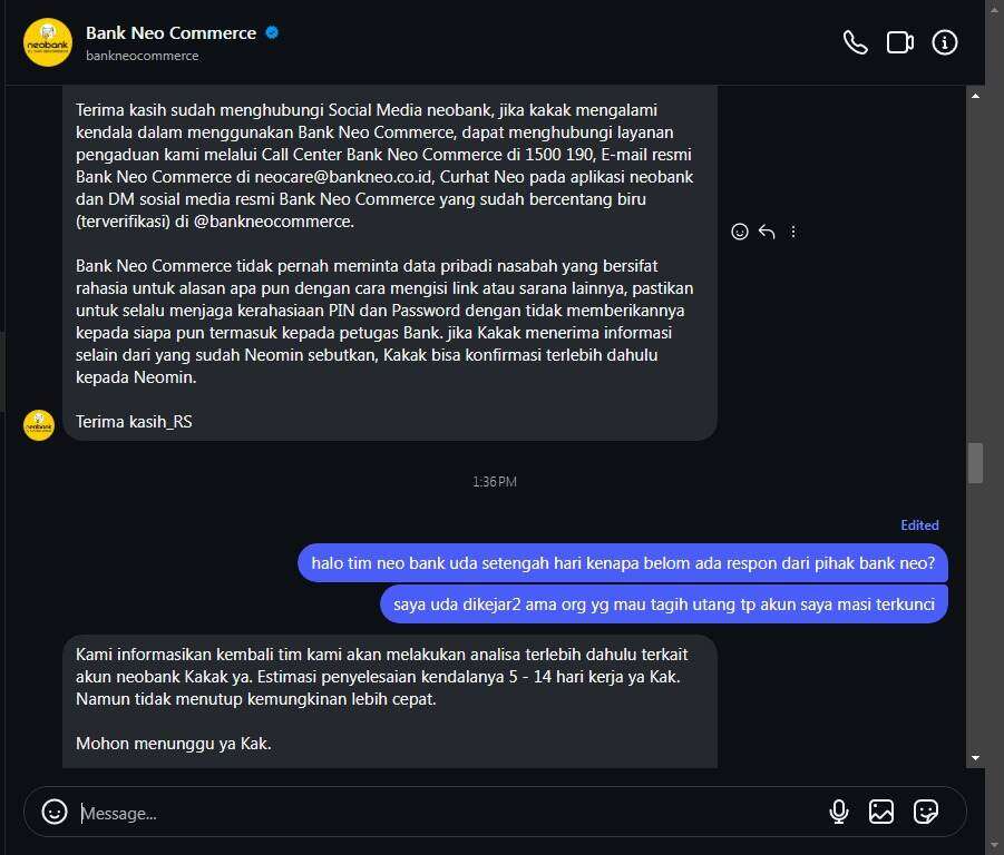 Merasa panik dan bingung, saya langsung menghubungi customer service Bank Neo dan melalui Instagram mereka. Namun, jawaban yang saya dapatkan justru membingungkan. Mereka hanya menyampaikan bahwa proses pengecekan memerlukan waktu 5 hingga 14 hari kerja.