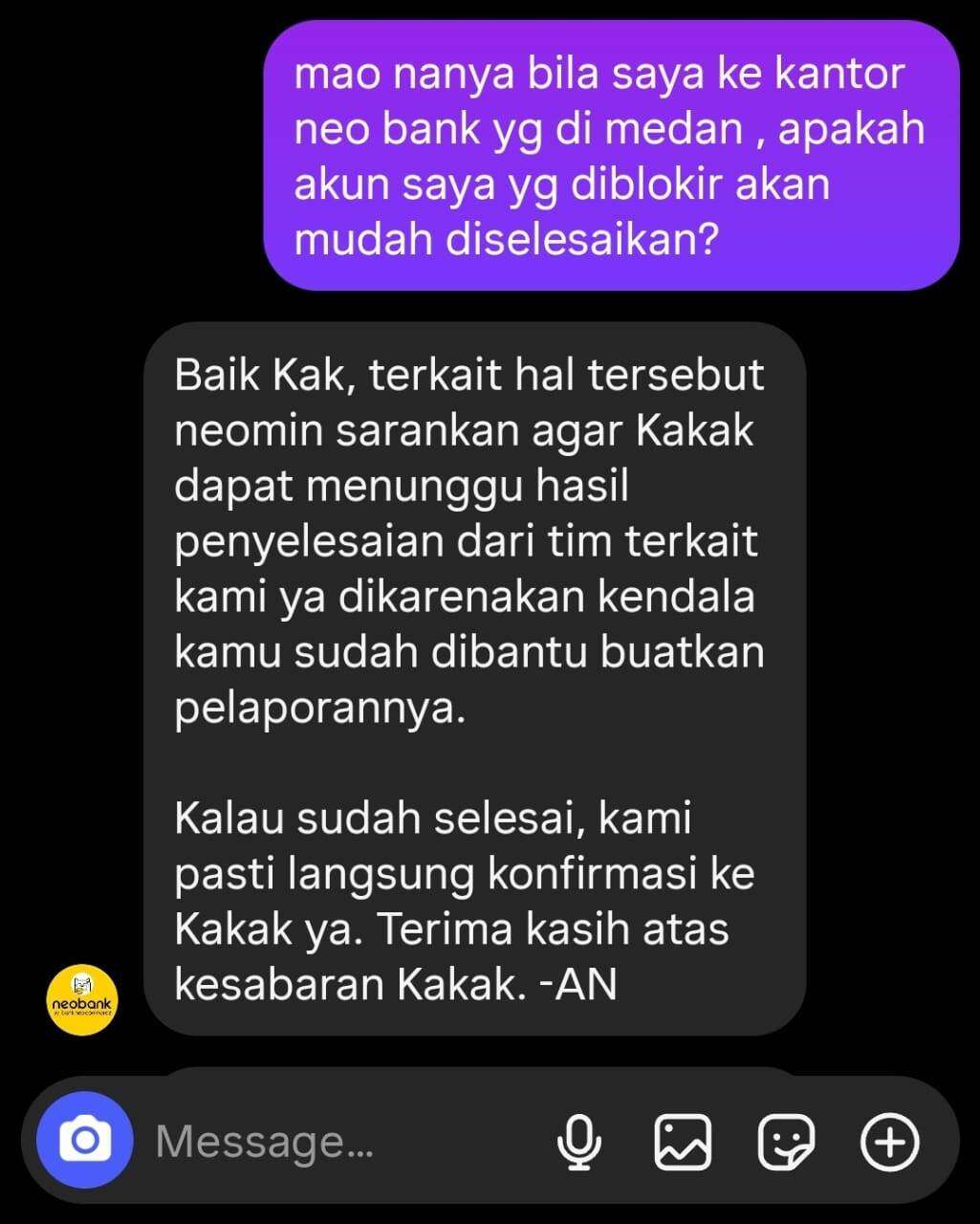 Saya mendesak Bank Neo untuk segera memulihkan akses akun saya dan memberikan penjelasan resmi. Saya juga meminta OJK dan otoritas terkait untuk menindak tegas praktik layanan keuangan seperti ini, agar masyarakat tidak lagi dirugikan oleh sistem yang seharusnya melindungi, bukan menyulitkan.