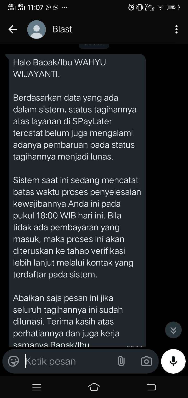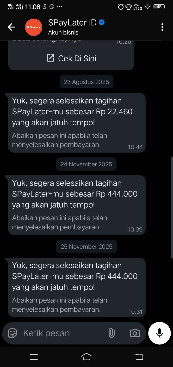 Setelah satu bulan berlalu, tepatnya pada tanggal 26, saya menerima pesan dari SPaylater yang mengingatkan tentang pembayaran tagihan akun saya. Saya sangat terkejut karena mengira semuanya sudah selesai sebulan yang lalu. Pada hari yang sama, saya kembali melaporkan masalah ini kepada Shopee melalui telepon. Pihak Shopee menjawab aduan saya, menyatakan bahwa semua transaksi yang berhasil adalah tanggung jawab pemilik akun dan saya diwajibkan untuk membayar. Saya merasa keberatan dengan hal ini, karena saya yakin tidak pernah melakukan transaksi apapun.