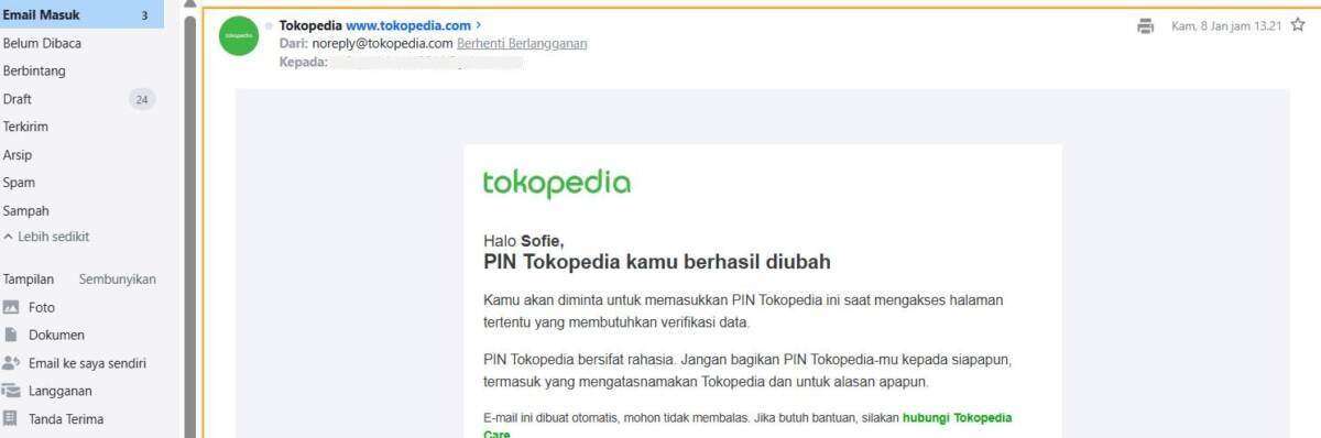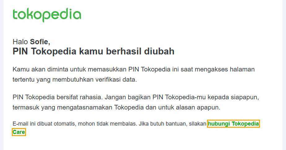 Terlampir screenshoot ketika saya mengetahui bahwa PIN saya sudah berubah. Sekarang saya sudah tidak bisa akses ke akun Tokopedia saya sama sekali, karena sudah diblokir oleh Tokopedia. Di situ terlihat tautan: “jika butuh bantuan silakan hubungi Tokopedia Care“, itulah yang saya klik dan mendapatkan alamat email bantuan@tkp-webcare.com tersebut. Namun setelahnya, respons yang saya dapati dari Tokopedia berasal dari email: bantuan@shop-tokopedia.com.