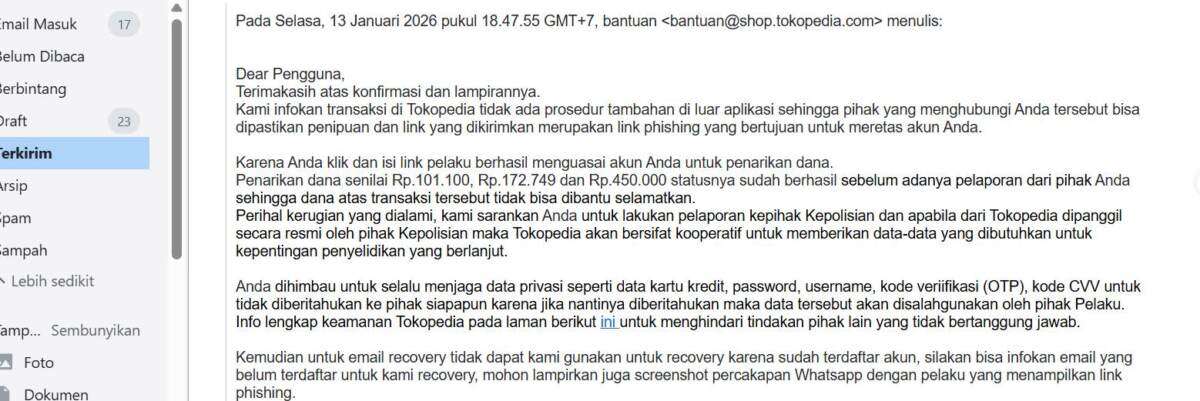 Pada tanggal 13 Januari 2026 pagi, saya menerima balasan dari Tokopedia yang mengonfirmasi bahwa saya telah diretas, dan beberapa saldo uang saya di akun Tokopedia telah dicuri oleh peretas.