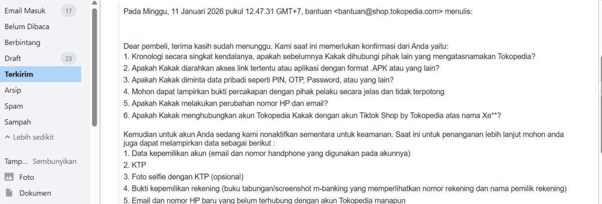 Pada tanggal 12 Januari 2026 pagi, saya akhirnya mendapatkan respons dari Tokopedia yang meminta saya untuk mengirimkan beberapa data atau dokumen. Saya pun mengirimkannya.