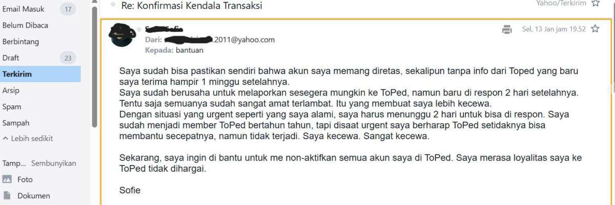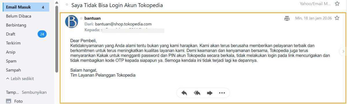 Ya tentu saja! Saya sudah melapor sejak tanggal 9, dan baru pada tanggal 11 Tokopedia baru merespons email saya dan memblokir akun saya. Bisa dibayangkan jika saya tidak serta merta memblokir kartu kredit saya tanggal 9 Januari 2026, tentu peretas sudah berhasil menggunakan kartu kredit saya.