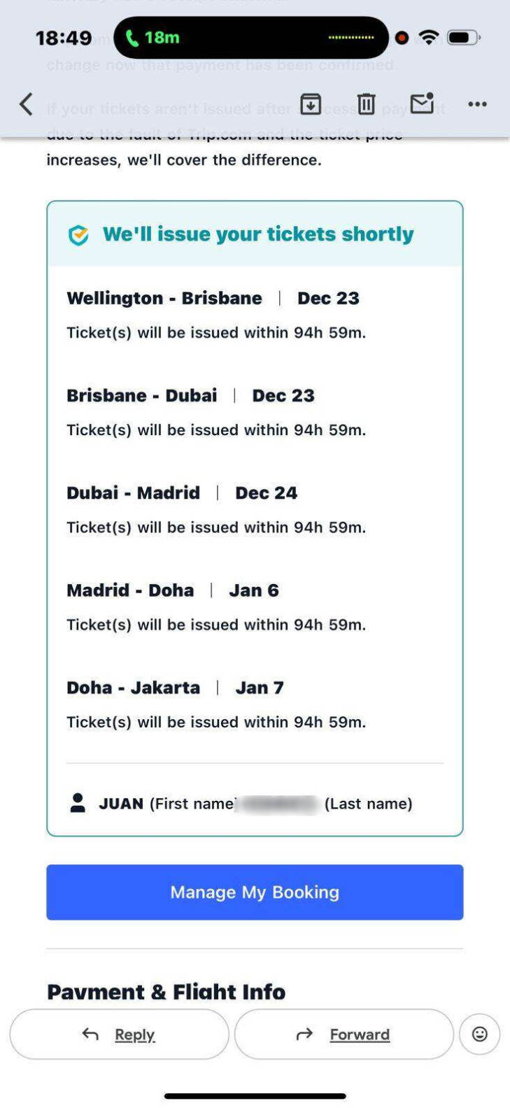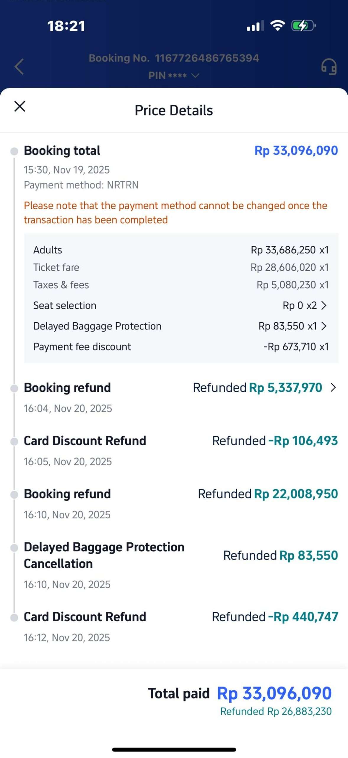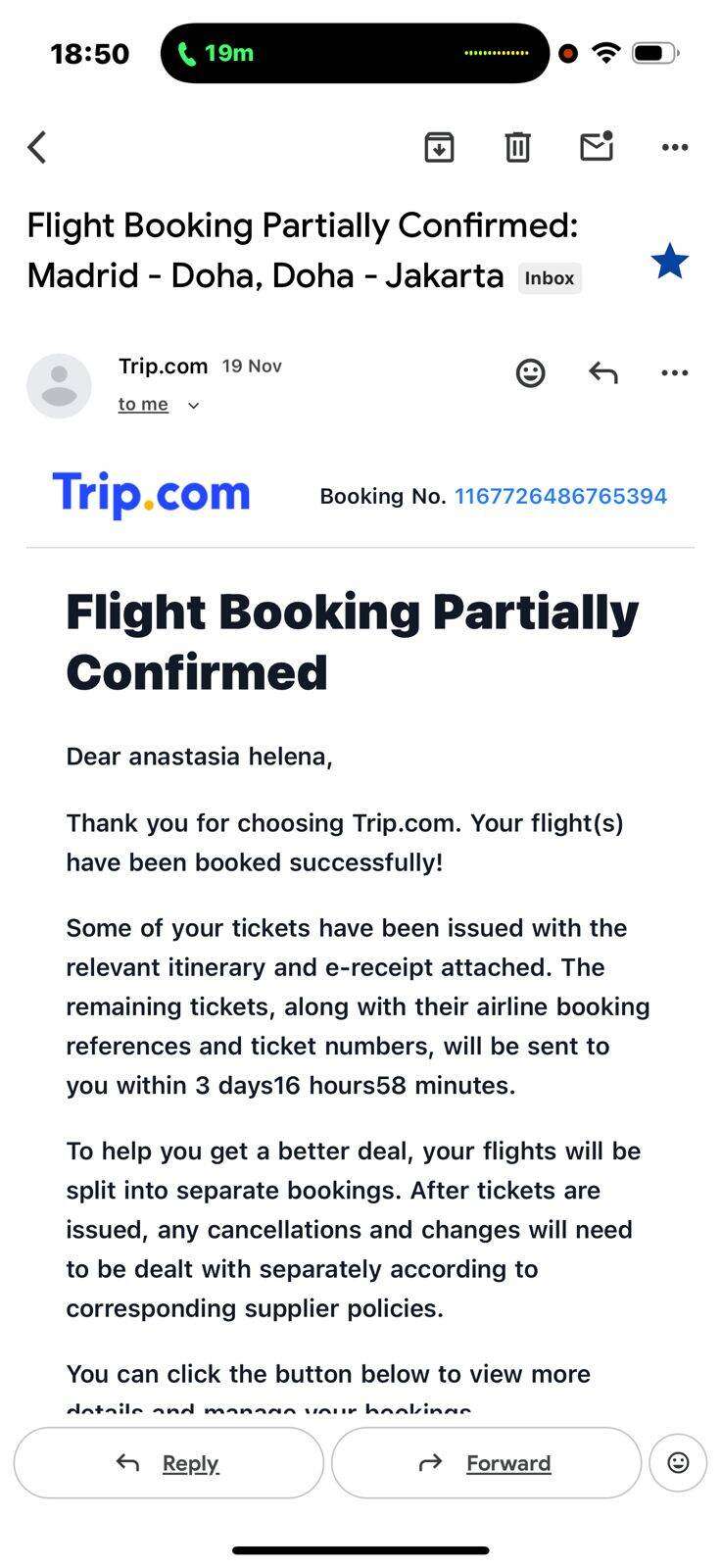 Pada hari Rabu, 19 November 2025, saya membeli tiket multi-kota melalui aplikasi Trip.com dengan detail sebagai berikut: