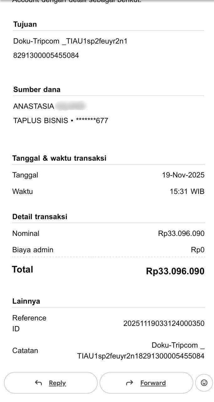 Saya berharap Trip.com dapat memberikan tanggapan tertulis resmi dan menyelesaikan permasalahan ini sesegera mungkin. Terima kasih atas perhatian Anda.