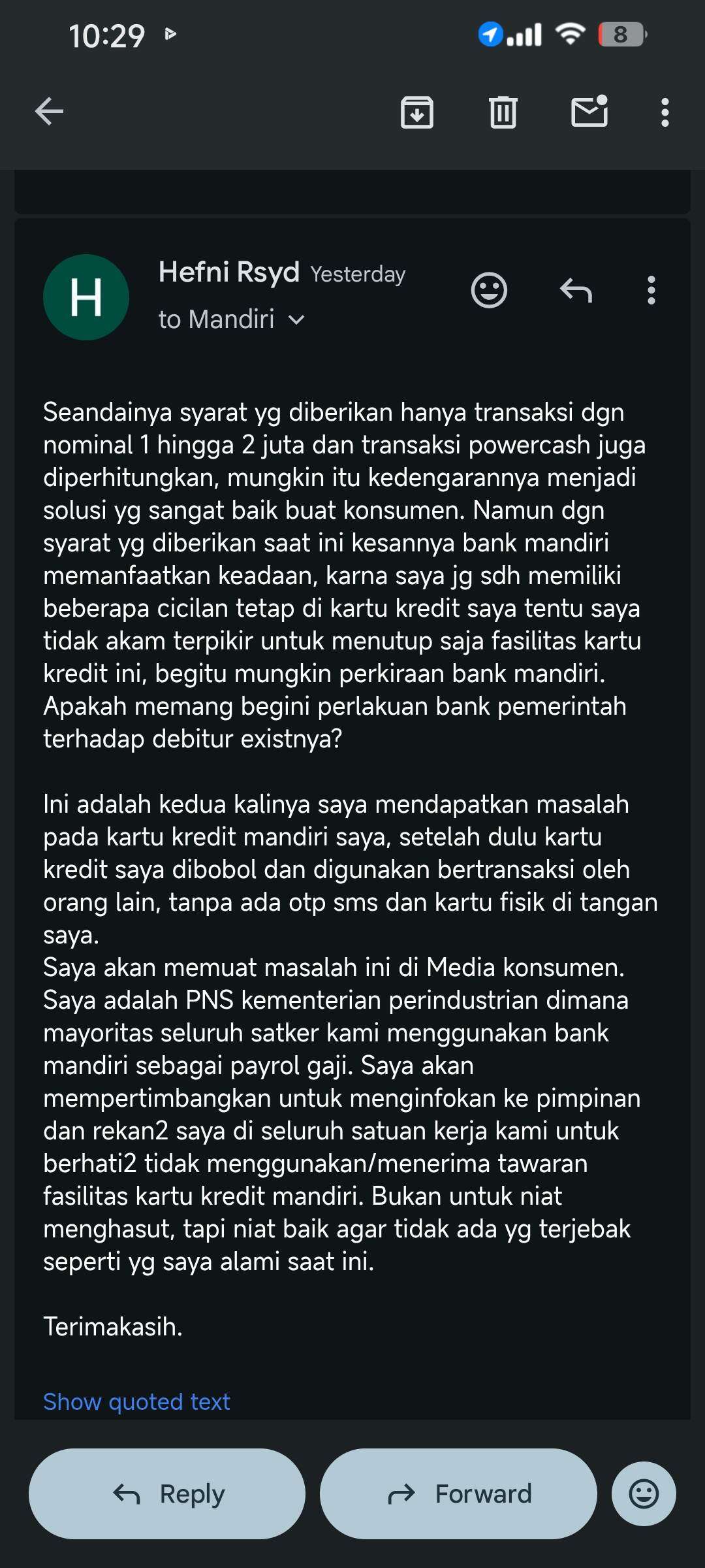 Dari awal hingga sekarang, saya selalu menjaga kelancaran fasilitas kartu kredit Bank Mandiri ini. Saya cukup kecewa dan merasa tertipu.