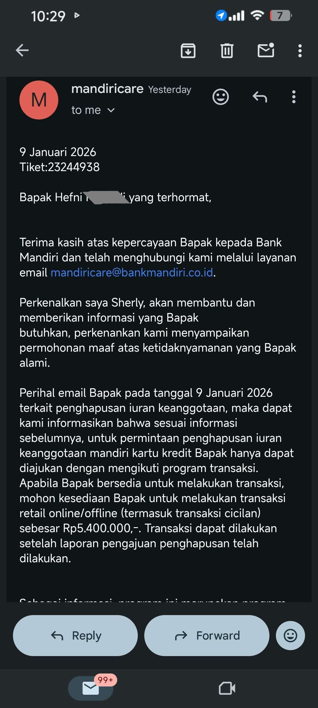 Saya mencoba mengirim email ke Bank Mandiri. Saya kemudian mendapatkan balasan dari email yang saya kirimkan sebelumnya ke Mandiri Care. Menurut keyakinan saya, Bank Mandiri sangat jeli melihat peluang untuk mendapatkan keuntungan dari debitur eksisting seperti saya.