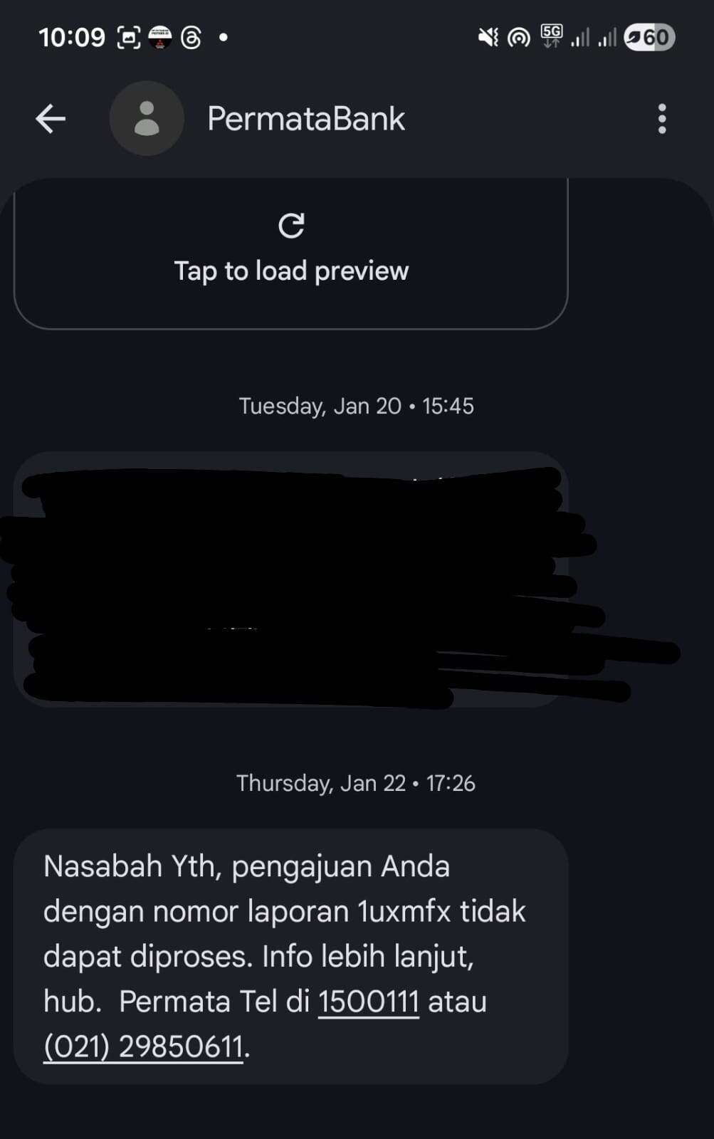 Selanjutnya, saya menghubungi Bank Permata melalui email ke care@permata.co.id dan juga melalui saluran telepon terkait permintaan pengembalian denda. Saya diminta menunggu, namun tidak ada tindak lanjut atau panggilan feedback apa pun setelahnya. Hingga akhirnya saya menghubungi customer service Permata melalui layanan pelanggan pada aplikasi Permata ME, barulah dibuatkan tiket pengaduan. Per tanggal 22 Januari 2026, terdapat SMS yang masuk ke nomor terdaftar saya di Permata ME yang menyatakan pengajuan saya tidak disetujui.