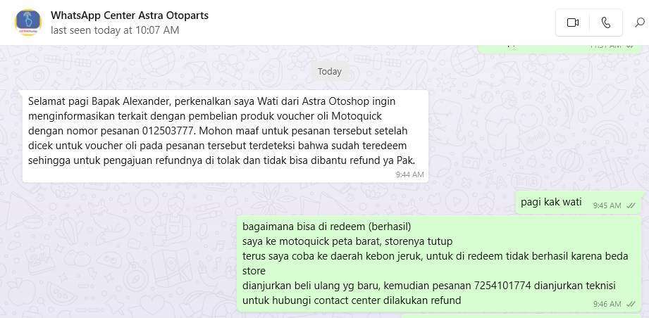 Saran dari teknisi agar saya menghubungi contact center Astra Otoparts untuk refund dan menganjurkan membeli voucher lagi melalui situs astraotoshop.com.