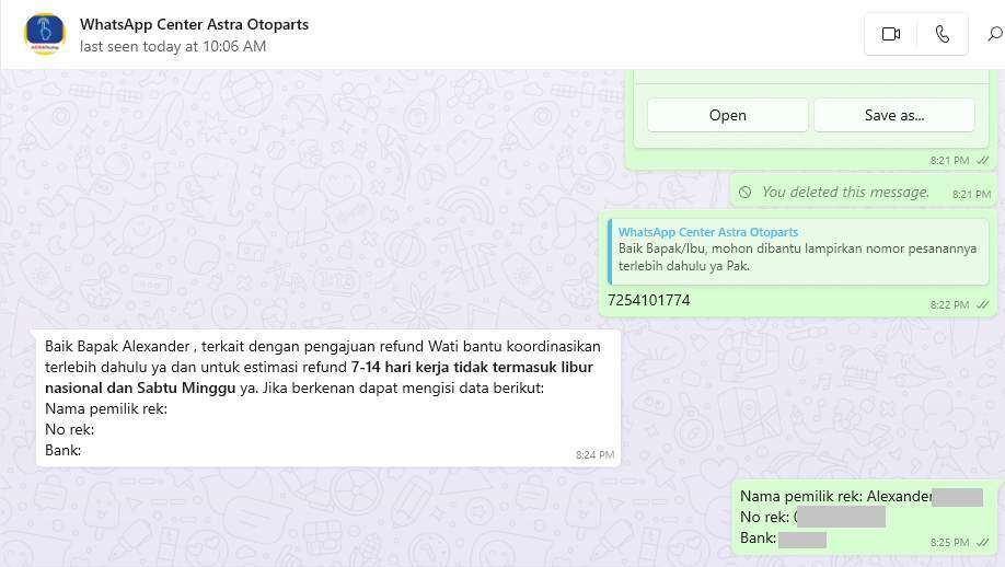 Di malam hari, saya chat contact center Astra Otoparts untuk melakukan refund, dan dijanjikan estimasi refund 7–14 hari kerja.