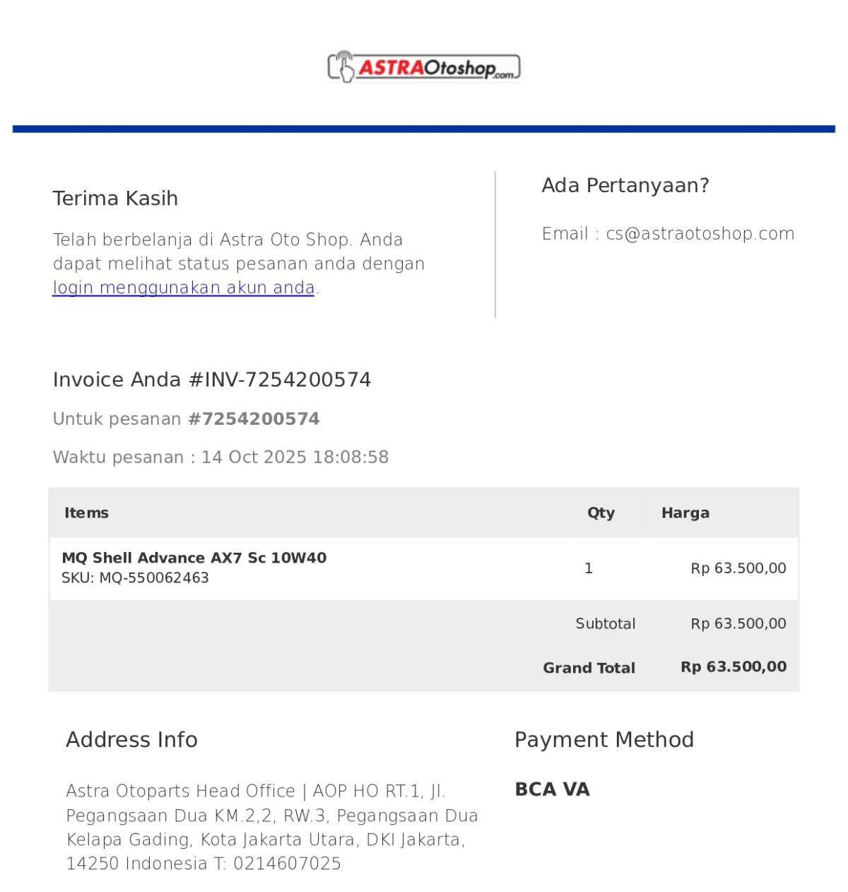 Pada tanggal 10 Oktober 2025, saya melakukan pembelian MQ Shell Advance AX7 SC 10W40 dengan nomor pembelian 7254101774, dengan tujuan claim voucher di dekat rumah, yaitu Motoquick Peta Barat 2, Jakarta Barat.