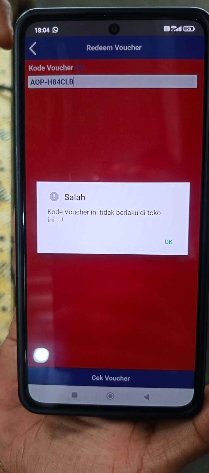 Pihak teknisi menginformasikan di awal bahwa tidak bisa karena beda store. Karena saya sedikit memaksa, akhirnya teknisi membuka aplikasi untuk membuktikan bahwa voucher saya tidak bisa di-claim karena beda store. Berikut foto dari device teknisi yang sempat saya dokumentasikan: