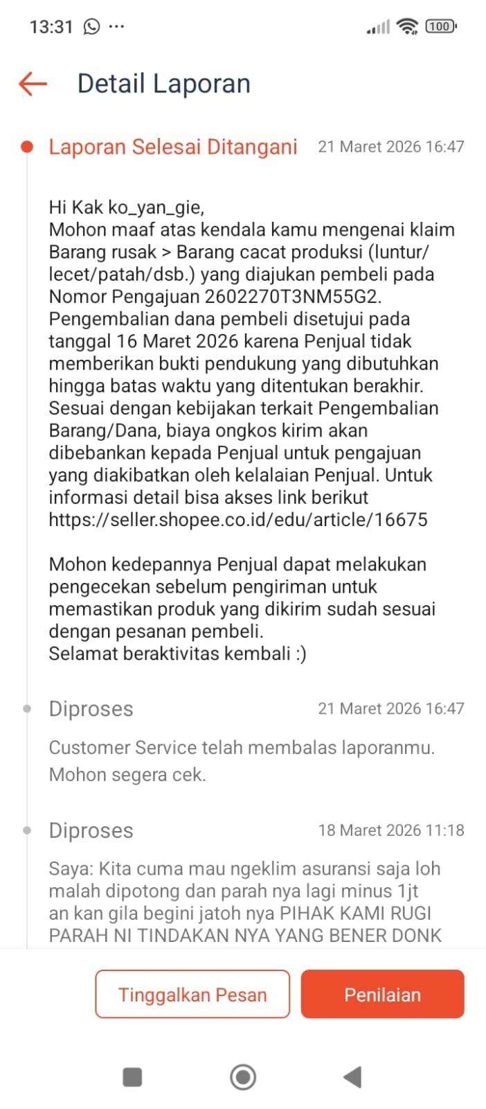 Kami menyampaikan keberatan keras atas penyelesaian laporan pengembalian/refund yang menurut kami sangat merugikan pihak penjual.