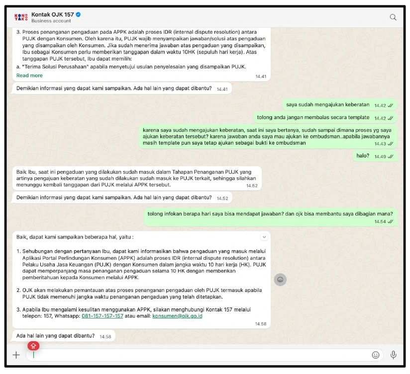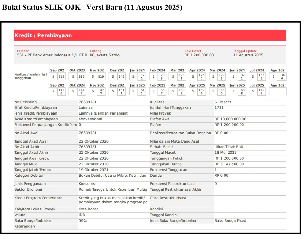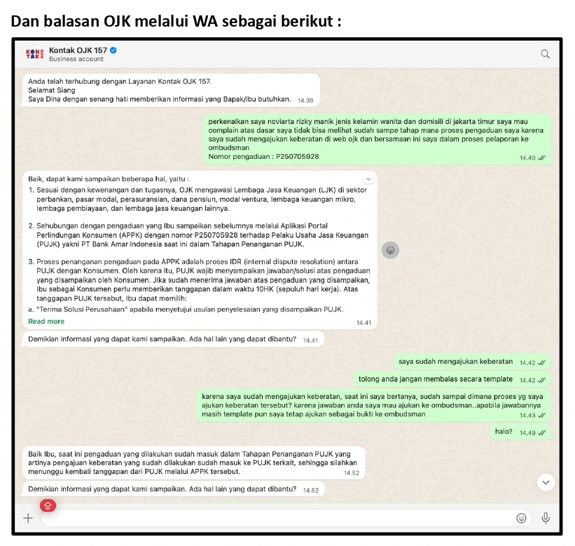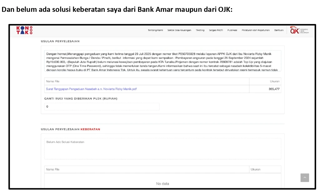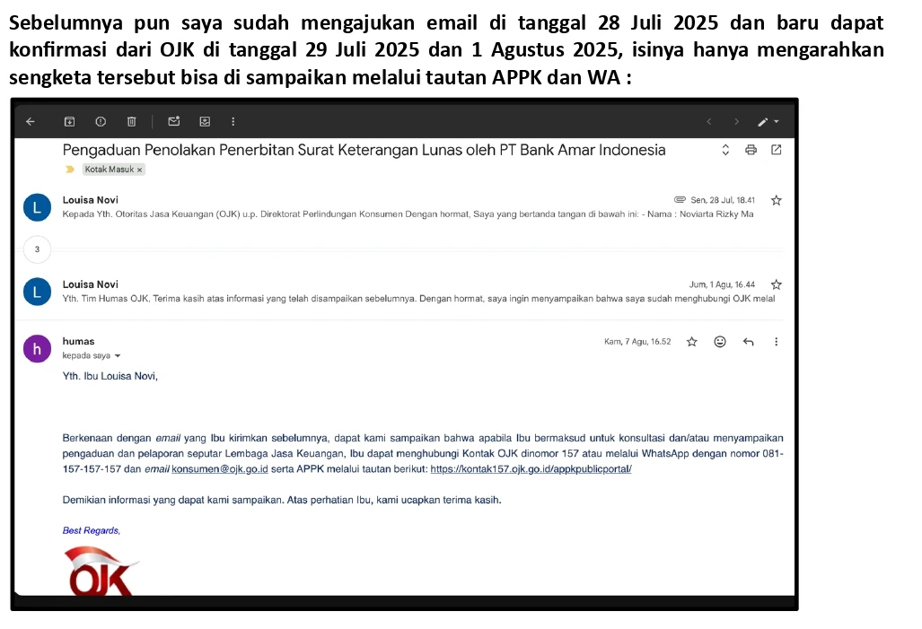 Saya telah mengadukan permasalahan ini ke OJK melalui APPK (Nomor Laporan: P250705928). Namun tanggapan yang saya terima dari OJK hanya sebatas meneruskan jawaban Bank Amar, tanpa ada proses mediasi atau upaya penyelesaian yang memadai. Fasilitas pengaduan yang diberikan OJK tidak menghasilkan solusi, sehingga sengketa tetap berlarut-larut. Upaya saya untuk menghubungi YLKI juga gagal karena kendala teknis pada penerimaan email.