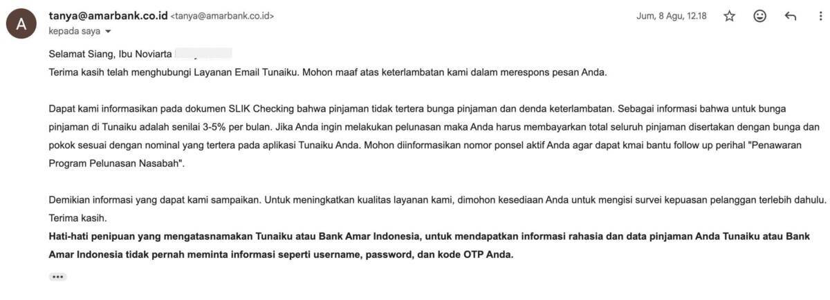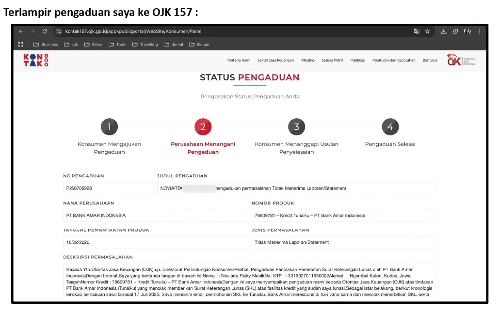 Saya ingin menyampaikan pengalaman saya sebagai konsumen yang hingga saat ini belum mendapatkan Surat Keterangan Lunas (SKL) dari PT Bank Amar Indonesia Tbk. (Tunaiku), meskipun pokok pinjaman saya telah dilunasi sepenuhnya.