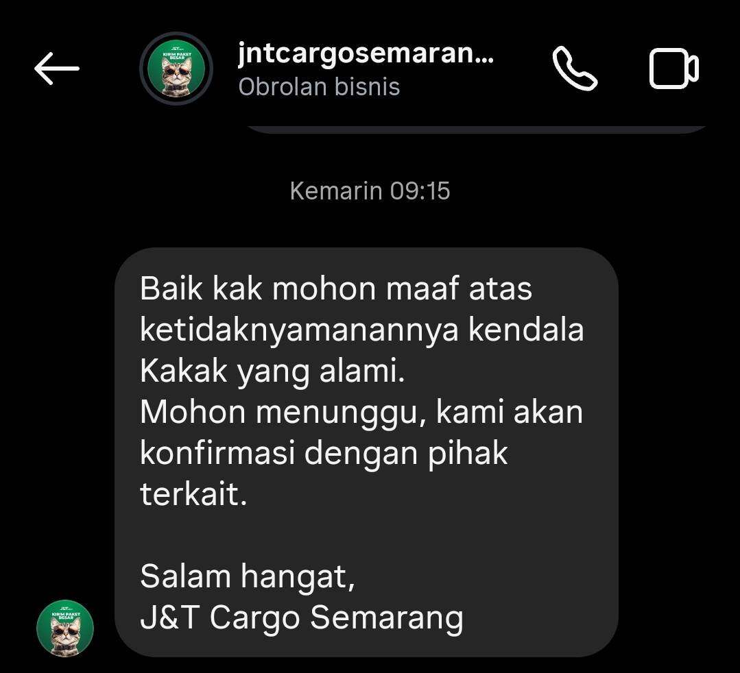 Saya sangat menyesalkan dengan penanganan J&T Cargo terhadap kendala paket, yang sangat lambat dalam memberikan respons dan hampir tidak ada solusi. Masalahnya hanya dilempar kesana kemari tanpa ada penyelesaian. Lalu, untuk apa membayar biaya pengiriman yang mahal dan asuransi jika ketika ada masalah dengan paket, tidak ada tanggung jawab sama sekali? Pegawai outlet pertama memberikan solusi untuk mengganti biaya pengiriman paket, tetapi hingga saat ini tidak ada kelanjutan dari hal tersebut.