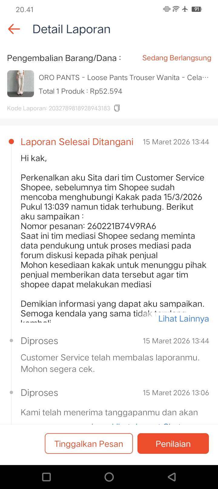 Pertama, pihak Shopee memberikan informasi yang tidak akurat. Pada 15 Maret 2026, CS Sit* berdalih bahwa saya tidak bisa dihubungi, padahal pada saat yang sama saya sedang aktif chat dengan CS lain.