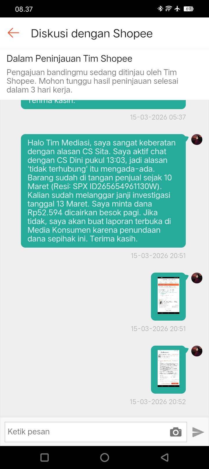 Berdasarkan bukti resi SPX Express ID265654961130W, barang retur saya sudah diterima oleh penjual sejak tanggal 10 Maret 2026 pukul 10.07. Tim Mediasi Shopee menjanjikan investigasi selesai maksimal tanggal 13 Maret 2026. Namun hingga hari ini, 16 Maret 2026, dana saya sebesar Rp52.594 masih berstatus “Sedang Divalidasi”.