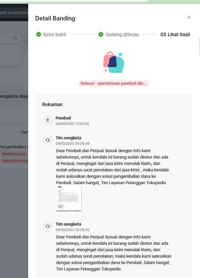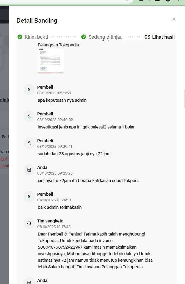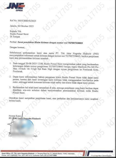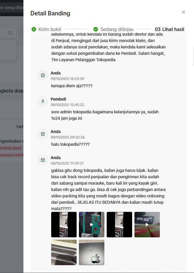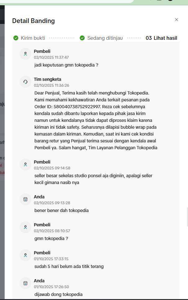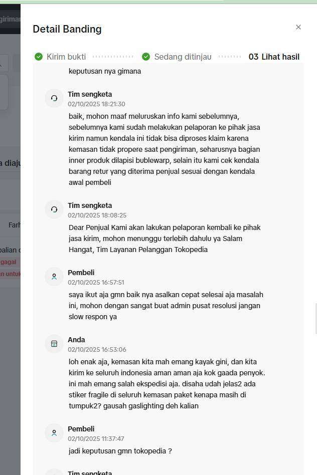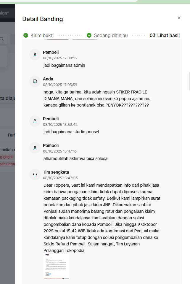 Proses sengketa dan investigasi berlangsung sangat lama dan tidak transparan. Hingga akhirnya, pada 9 Oktober 2025 pihak JNE menerbitkan surat klaim tidak bisa diproses dan Tokopedia memutuskan untuk mengembalikan dana kepada pihak pembeli karena sengketa atau klaim kami ditolak dengan alasan packing tidak sesuai standar.