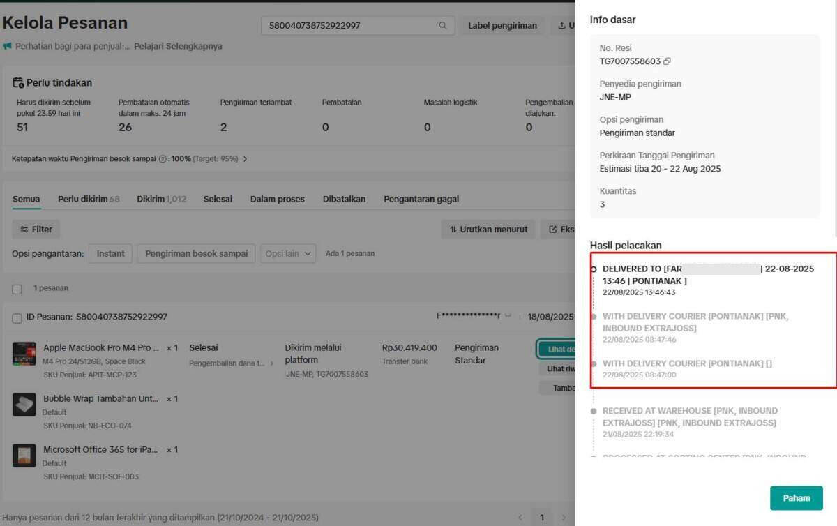Pesanan dinyatakan telah diterima pembeli pada 22 Agustus 2025 pukul 13.46 WIB di alamat Pontianak. Status pengiriman menunjukkan: DELIVERED TO FAR**** | 22-08-2025 13.46 | PONTIANAK.