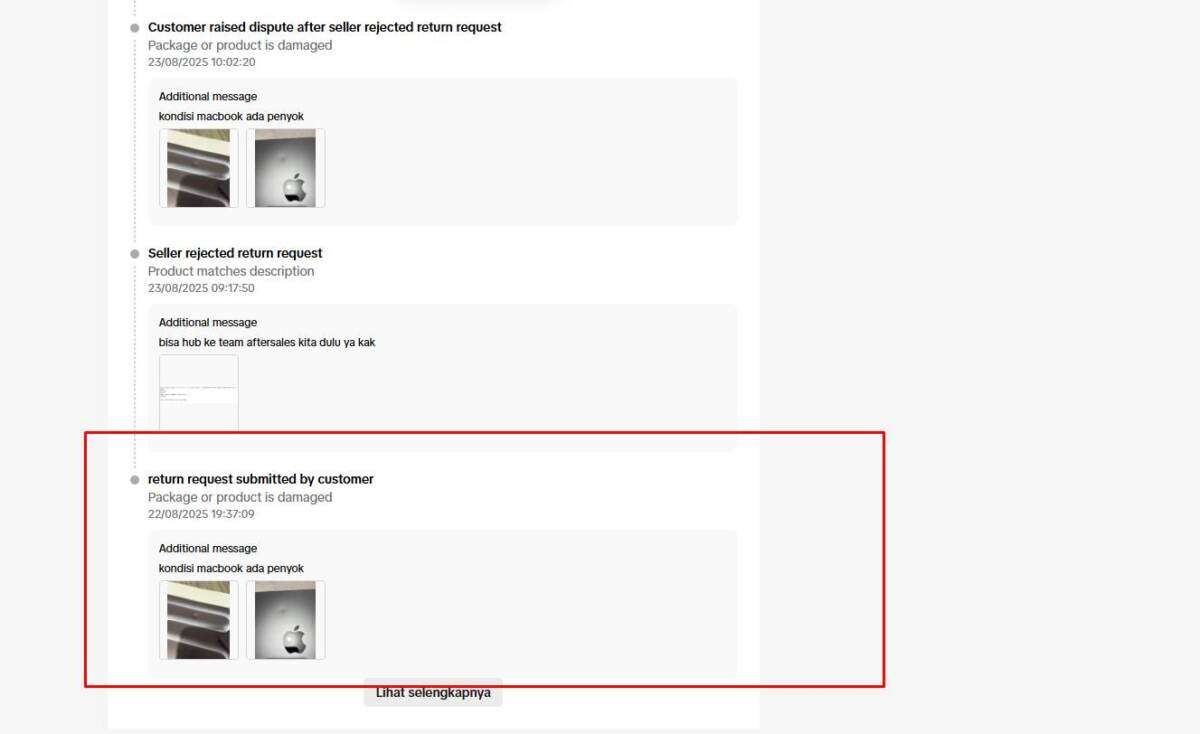 Pada hari yang sama (22 Agustus 2025), pembeli mengajukan komplain karena mengklaim bahwa barang yang diterima mengalami penyok pada bagian bodi. Bukti unboxing dari pihak pembeli dapat dilihat pada tautan berikut: