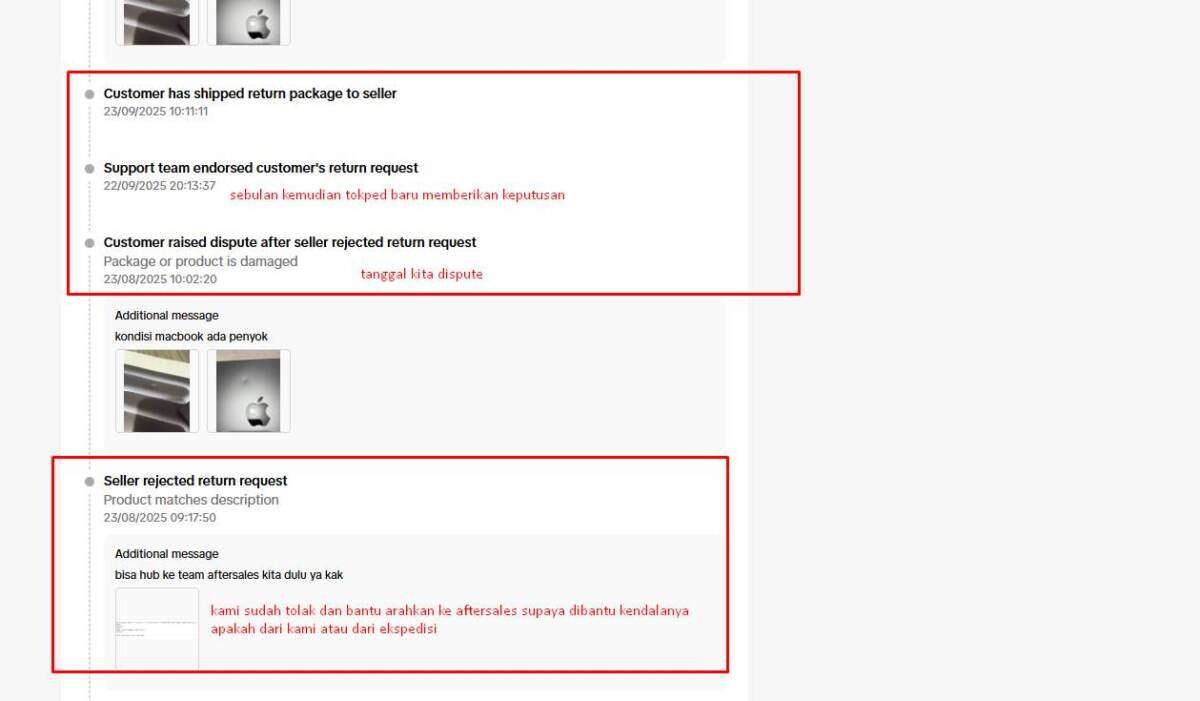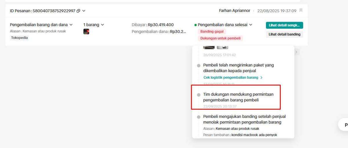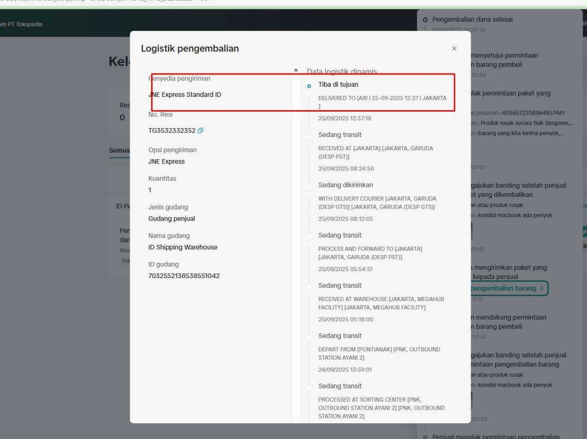 Pada 22 September 2025, pihak Tokopedia memutuskan bahwa barang harus diretur ke pihak kami sebagai seller.