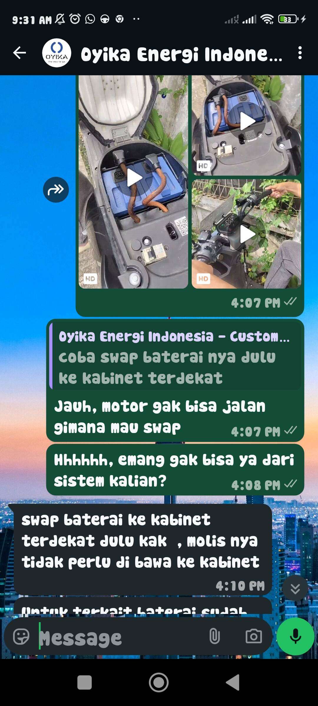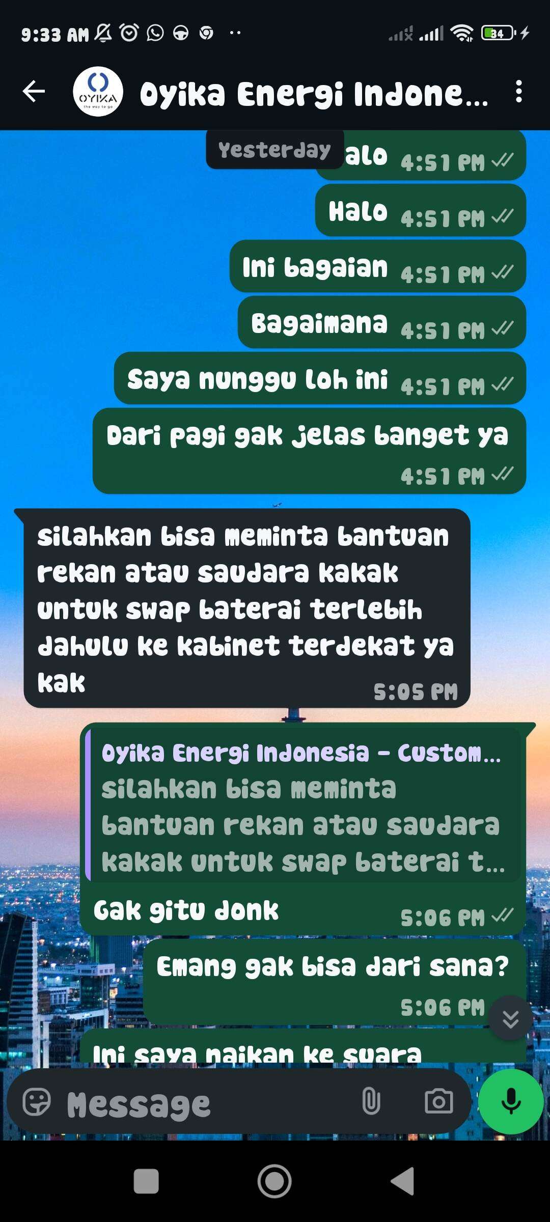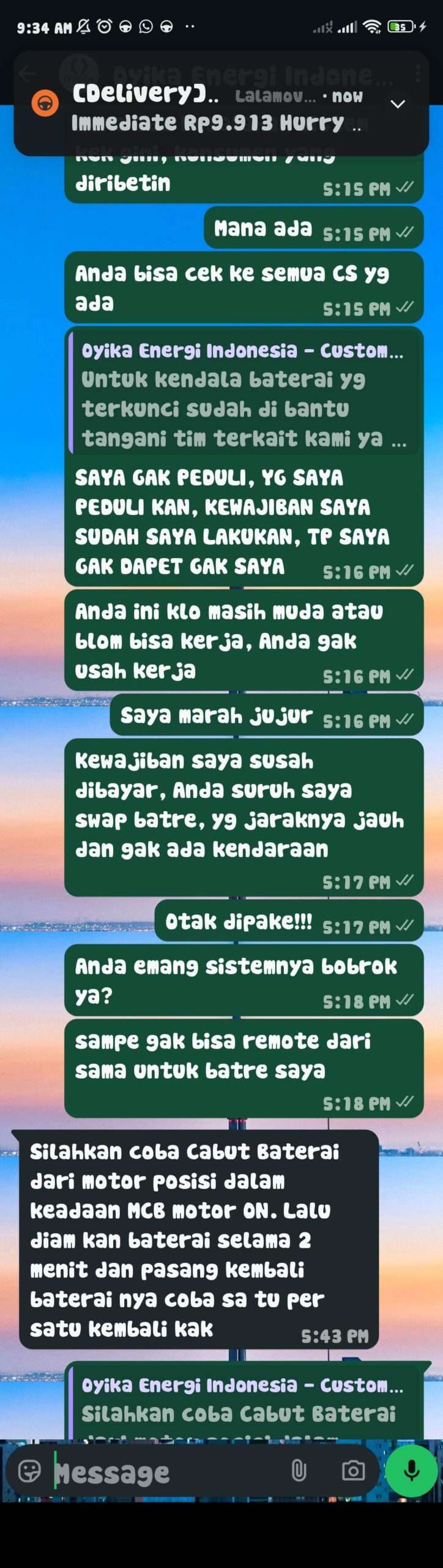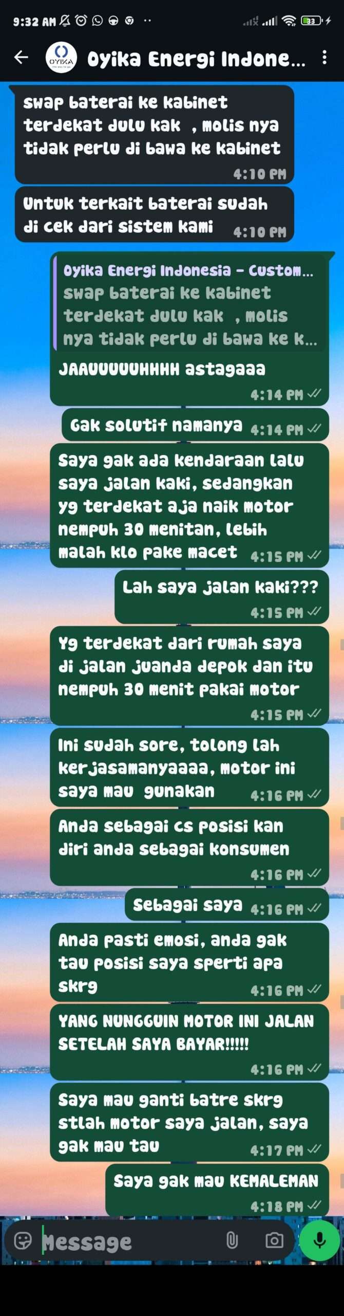 - CS OYIKA yang menangani kasus ini sama sekali tidak solutif dan tetap berpendapat bahwa baterai harus ditukar. Secara logis, stasiun penukaran baterai berjarak lebih dari 30 menit dengan motor dari rumah saya. Bayangkan waktu yang diperlukan jika harus berjalan kaki. Mereka menyarankan untuk meminjam motor teman atau saudara untuk pergi ke stasiun, namun hal ini bukan solusi yang masuk akal dan hanya menyulitkan konsumen. Saya yakin pihak OYIKA juga akan merasa kesal jika mengalami hal serupa.