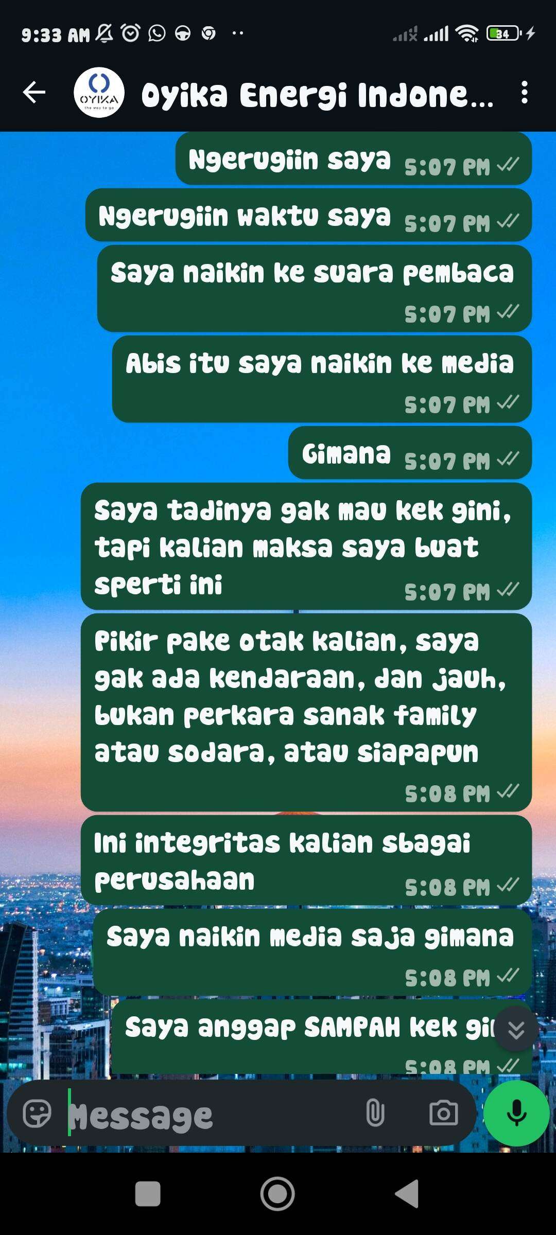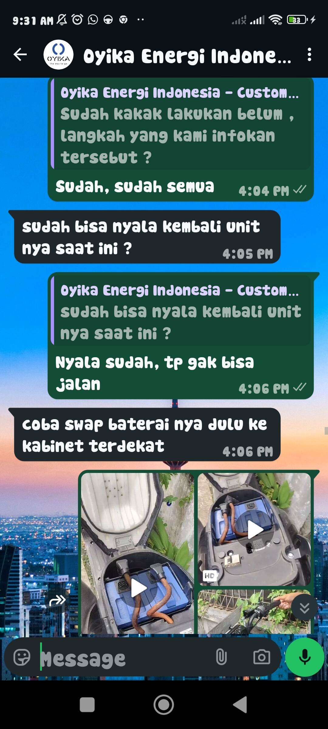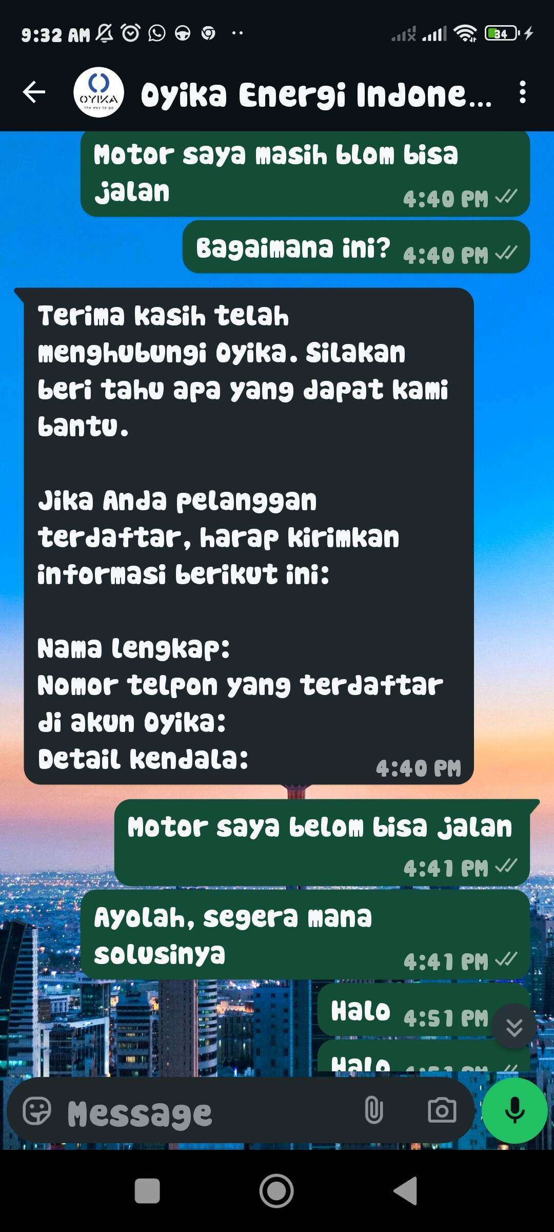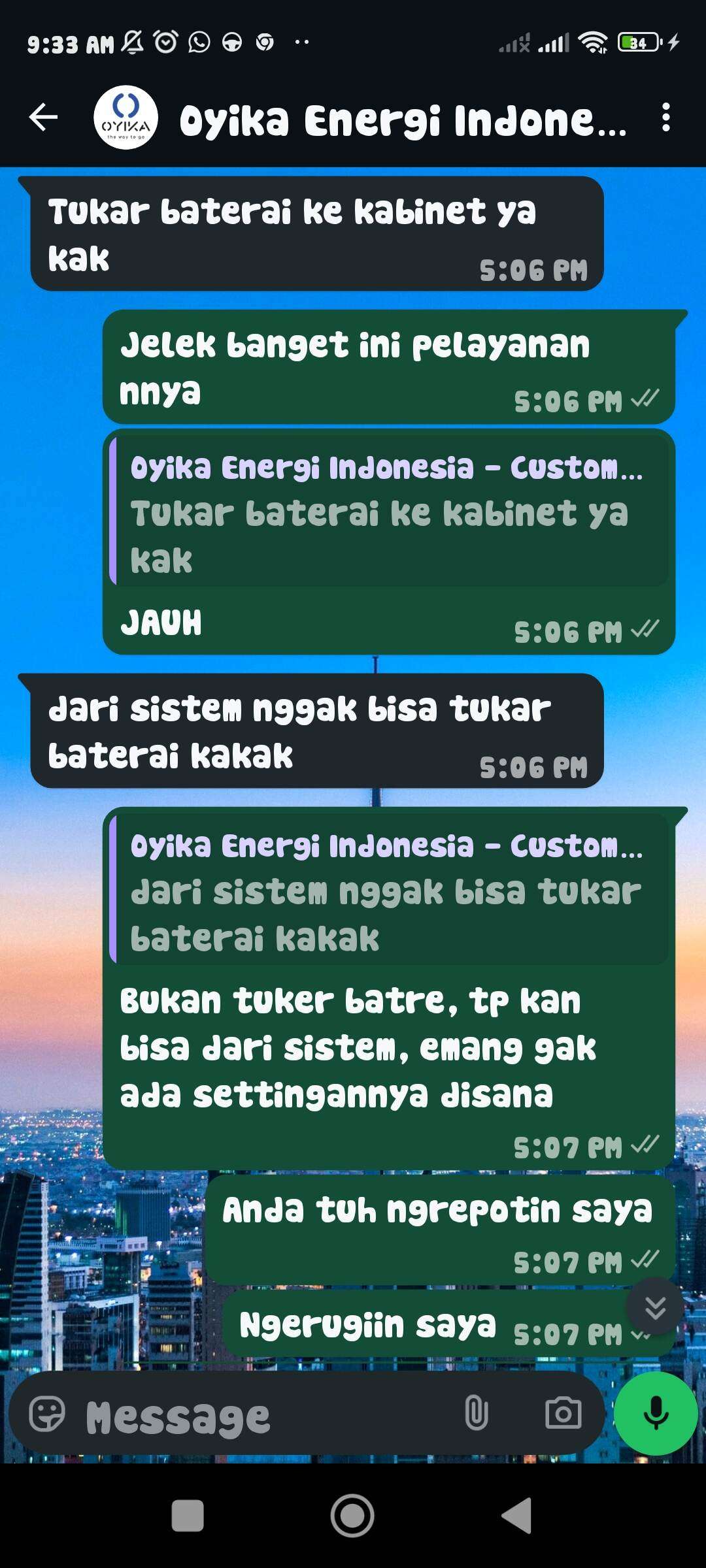 - CS OYIKA yang menangani kasus ini sama sekali tidak solutif dan tetap berpendapat bahwa baterai harus ditukar. Secara logis, stasiun penukaran baterai berjarak lebih dari 30 menit dengan motor dari rumah saya. Bayangkan waktu yang diperlukan jika harus berjalan kaki. Mereka menyarankan untuk meminjam motor teman atau saudara untuk pergi ke stasiun, namun hal ini bukan solusi yang masuk akal dan hanya menyulitkan konsumen. Saya yakin pihak OYIKA juga akan merasa kesal jika mengalami hal serupa.