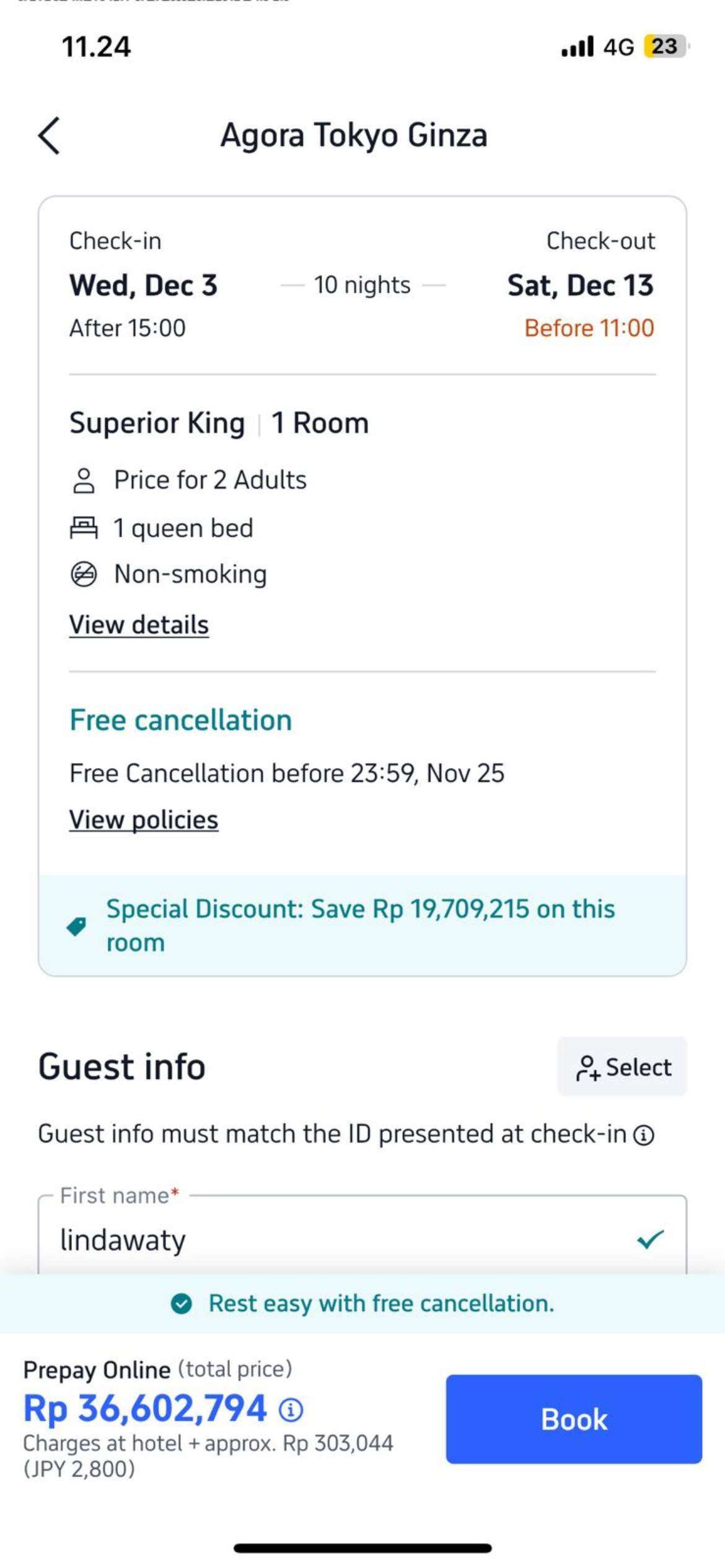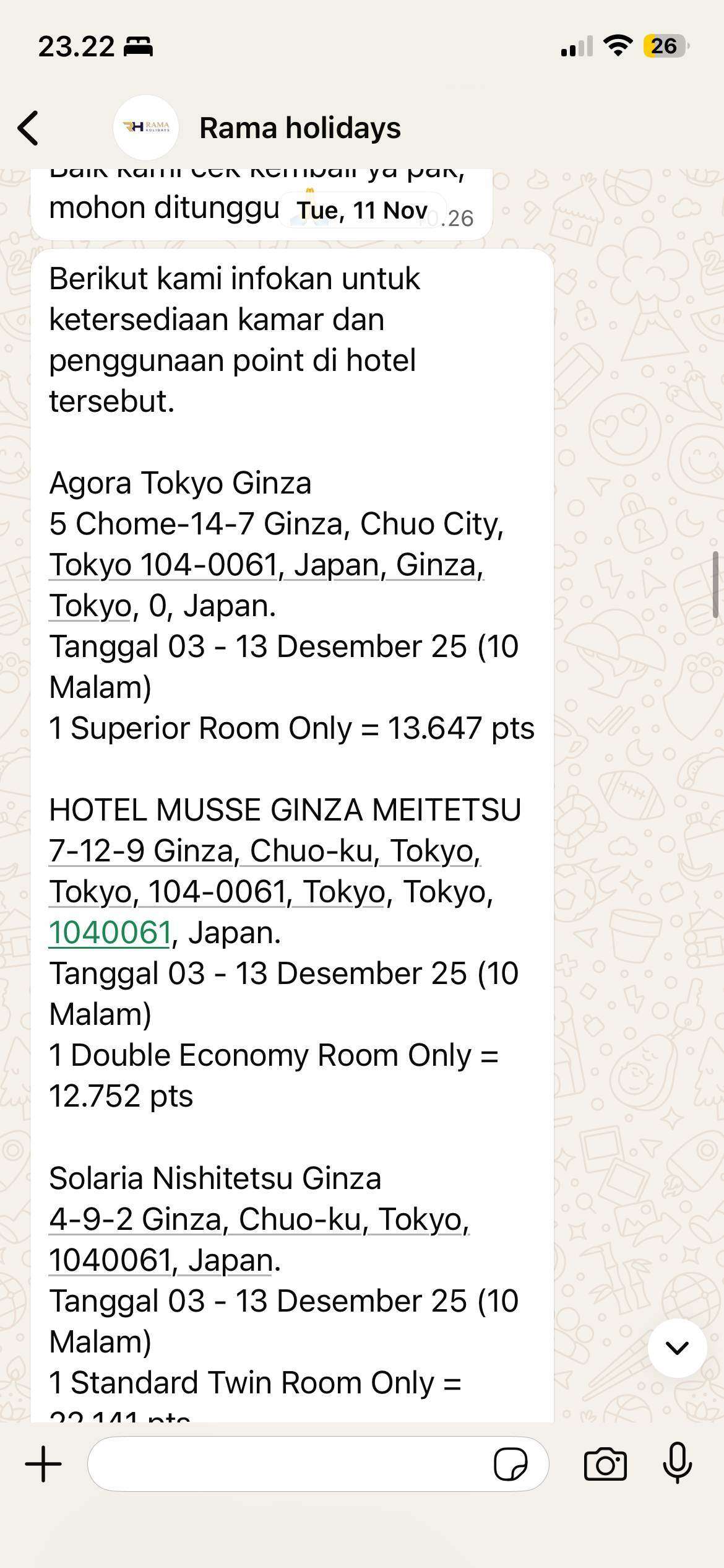 Pada 9 November 2025, saya menghubungi Rama Holidays untuk menanyakan tarif hotel di Jepang, mencakup lima jenis hotel. Ternyata, harga hotel tersebut sekitar 45% lebih tinggi dibandingkan dengan harga yang saya temukan di aplikasi online Trip.com. Sebagai contoh, Agora Tokyo Ginza untuk periode 3 – 13 Desember 2025, 1 kamar superior tanpa sarapan = 13.647 poin.