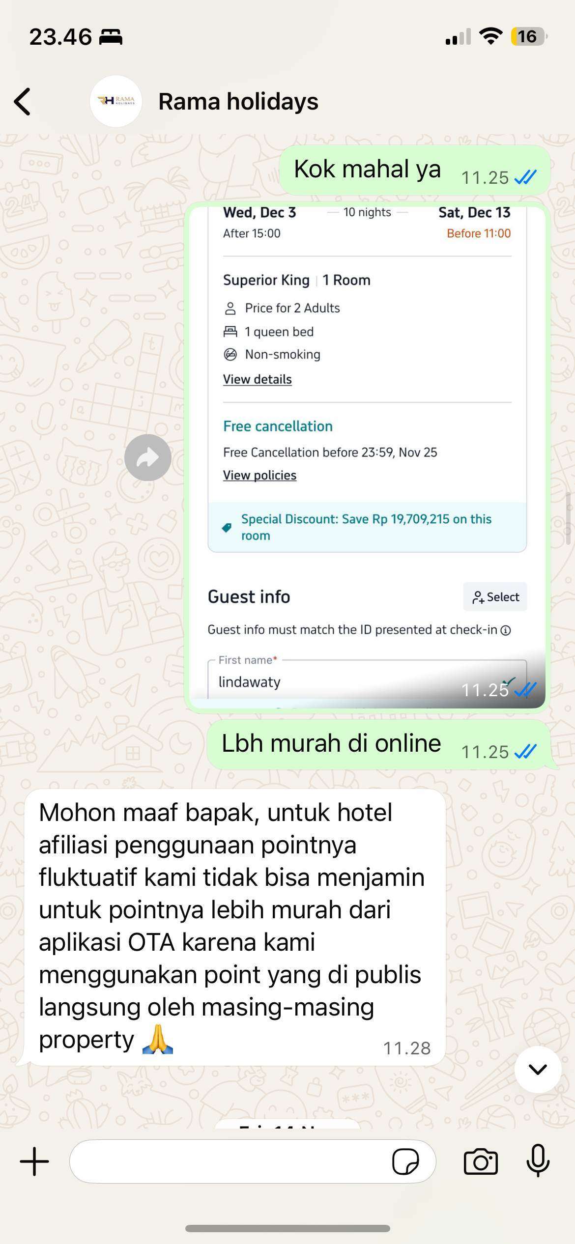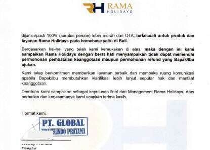 Saya telah mengajukan keluhan berkali-kali. Awalnya, nomor telepon Rama Holidays dapat dihubungi, tetapi setelah seminggu, tidak bisa dihubungi lagi. Untuk komunikasi melalui WhatsApp, responnya sangat lambat dan sering diabaikan. Customer Service Rama Holidays menyatakan bahwa harga yang lebih murah adalah untuk hotel dalam grup Rama Holidays sendiri, bukan untuk hotel lain. Ini jelas merupakan kebohongan yang dilakukan oleh Rama Holidays saat melakukan penjualan.
