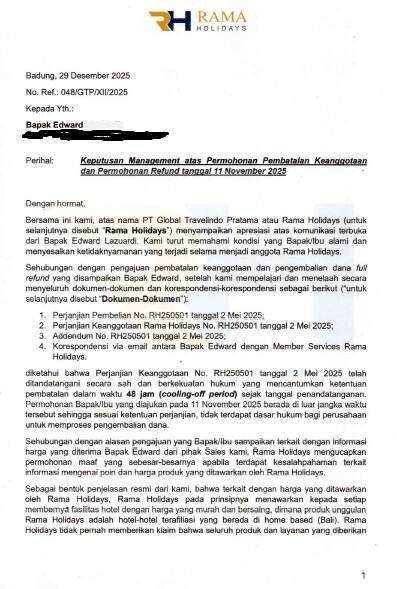 Saya meminta untuk berbicara langsung dengan pihak manajemen, tetapi tidak pernah mendapatkan tanggapan. Hingga akhirnya, pihak manajemen yang diwakili oleh W**** P****** sebagai direktur mengirimkan surat melalui email pada tanggal 31 Desember 2025, yang menyatakan bahwa mereka tidak dapat melakukan refund.