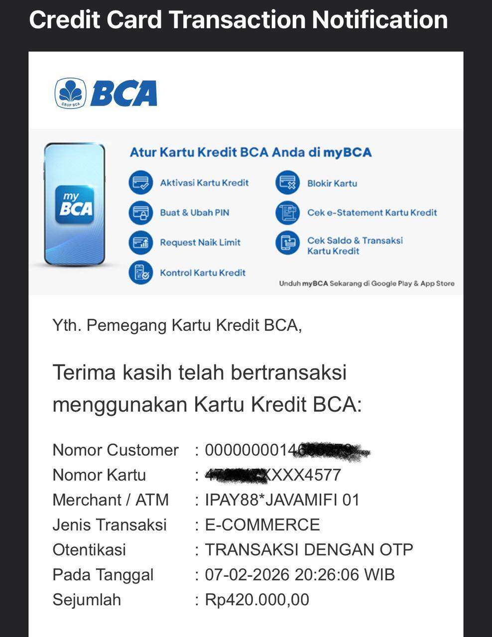 Transaksi kedua saya adalah 420.000 rupiah (terlampir).
