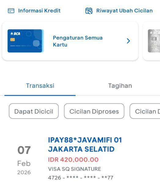 Pada tanggal 7 Februari 2026 saya bertransaksi 2x di merchant yang sama yaitu Java Mifi.