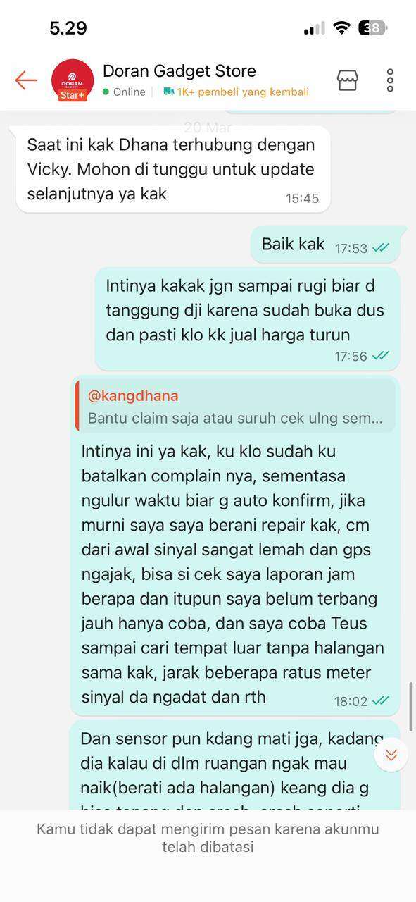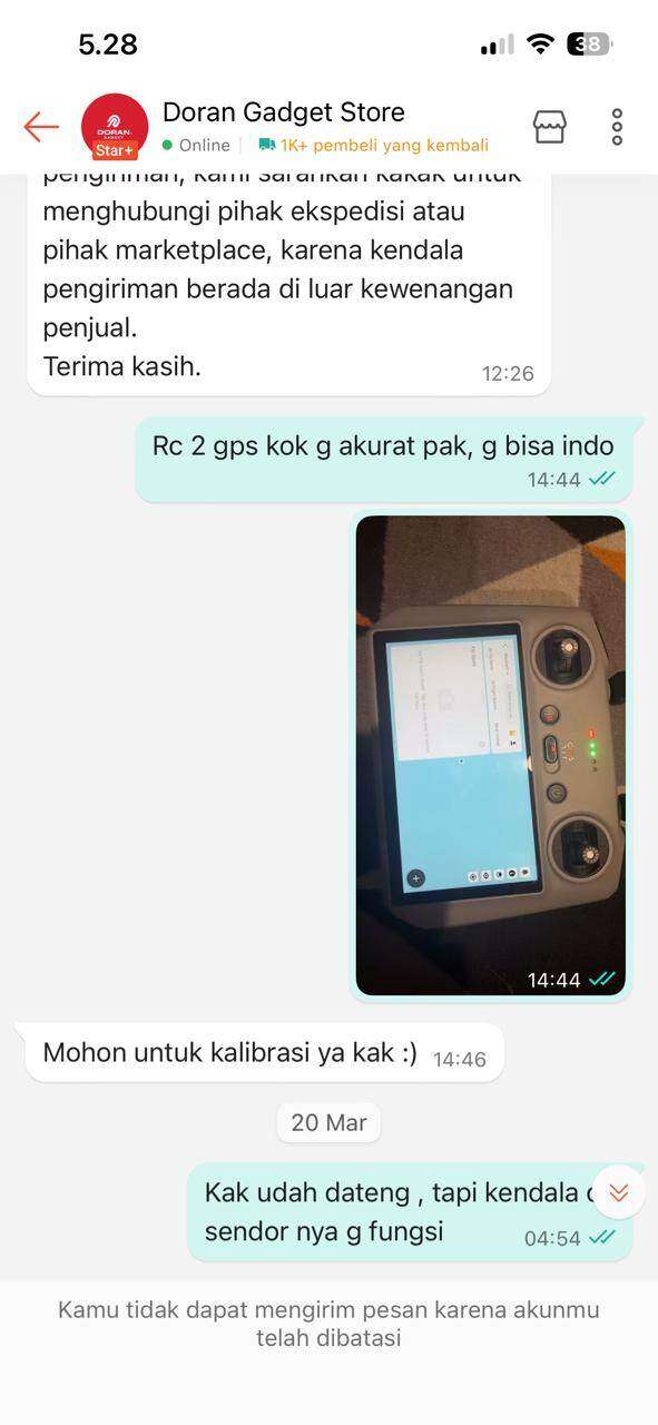Pada tanggal 18 Maret 2026, saya membeli sebuah drone di toko Doran Gadget Store dengan harga Rp13.499.000. Saat barang diterima, kondisi drone sudah bermasalah, yaitu GPS tidak akurat. Saya kemudian menghubungi pihak penjual dan hanya disarankan untuk melakukan kalibrasi.