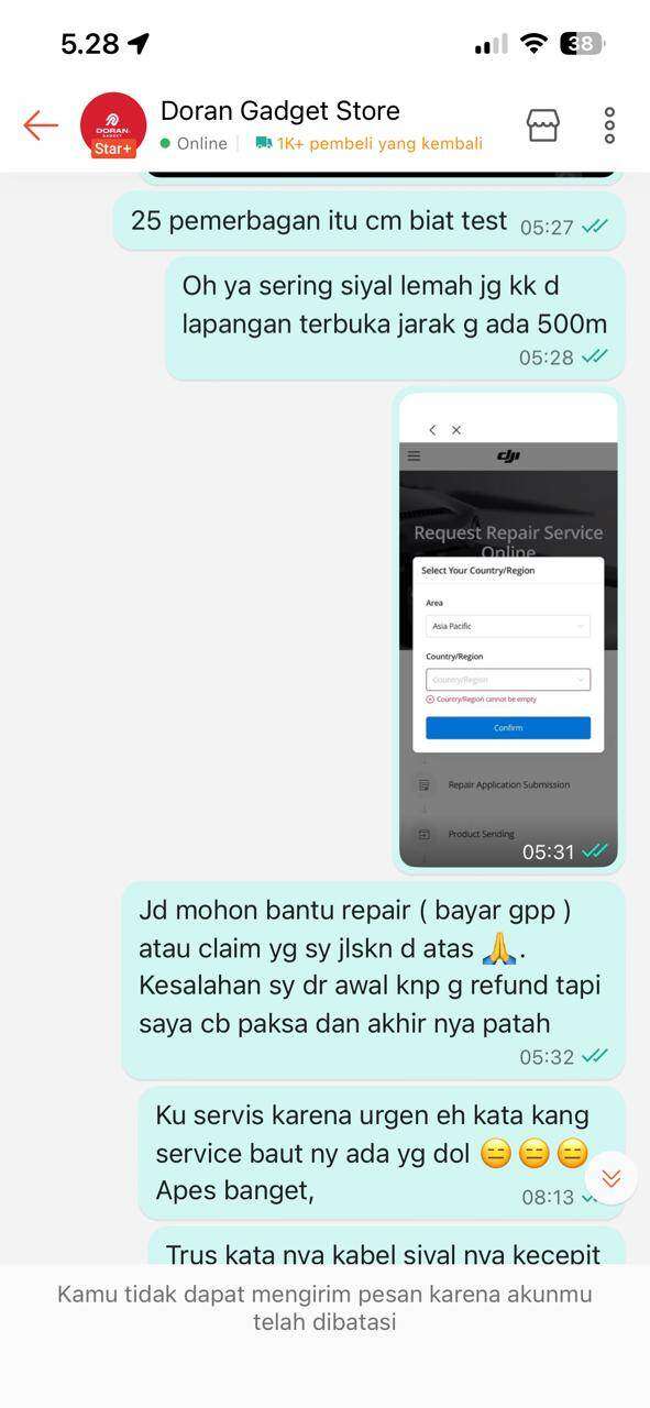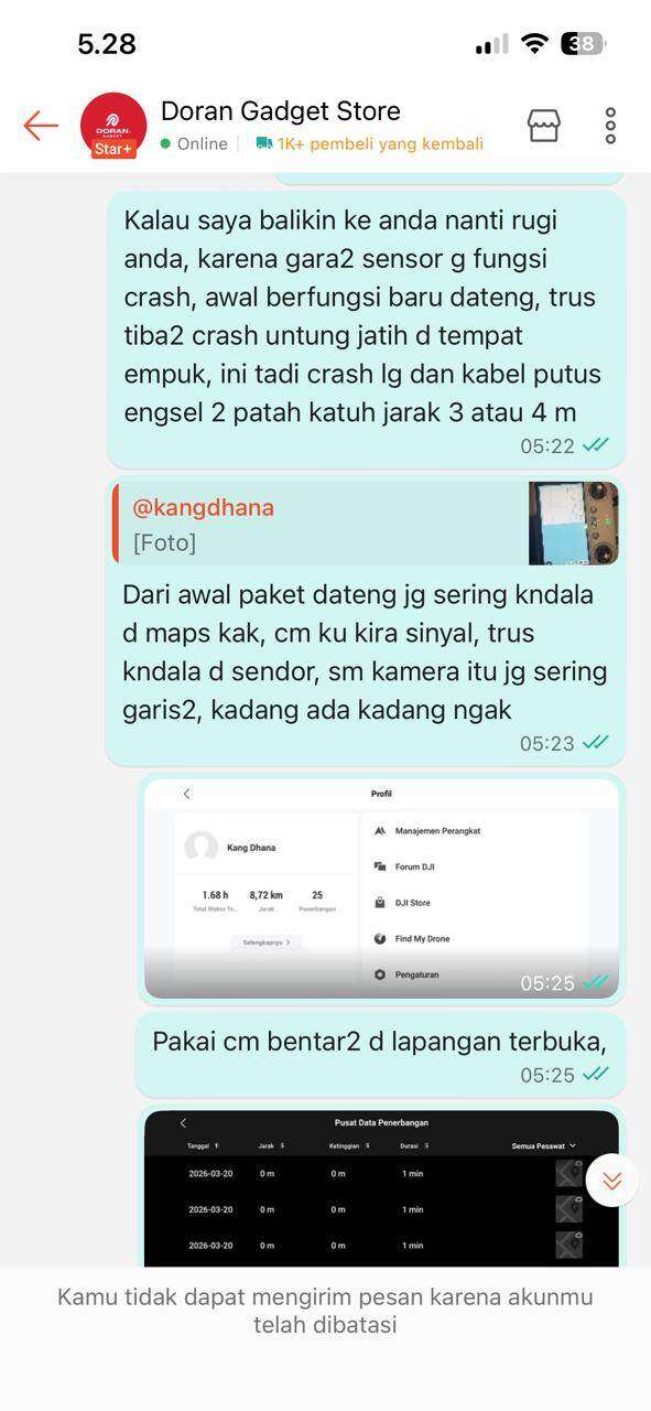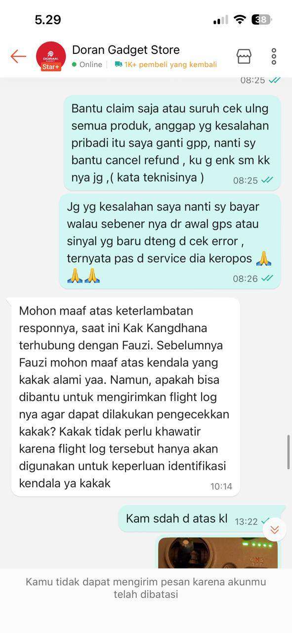 Setelah itu, saya kembali menghubungi seller untuk meminta bantuan klaim garansi, termasuk garansi DJI Care, mengingat sebelumnya seller menyatakan bisa membantu proses tersebut. Namun seller meminta data log penerbangan untuk analisis, dan hingga saat ini tidak ada kejelasan sama sekali, hanya diminta menunggu tanpa kepastian.