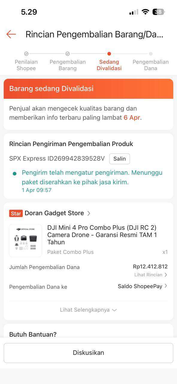 Lebih parah lagi, setelah proses konfirmasi, paket pengembalian saya sejak tanggal 1 April tidak juga diambil oleh pihak terkait hingga saat ini. Setiap hari saya menghubungi customer service Shopee, namun jawaban yang diberikan selalu berbelit-belit dan tidak memberikan solusi nyata. Dan setiap hari saya selalu minta follow up tentang penjemputan barang.