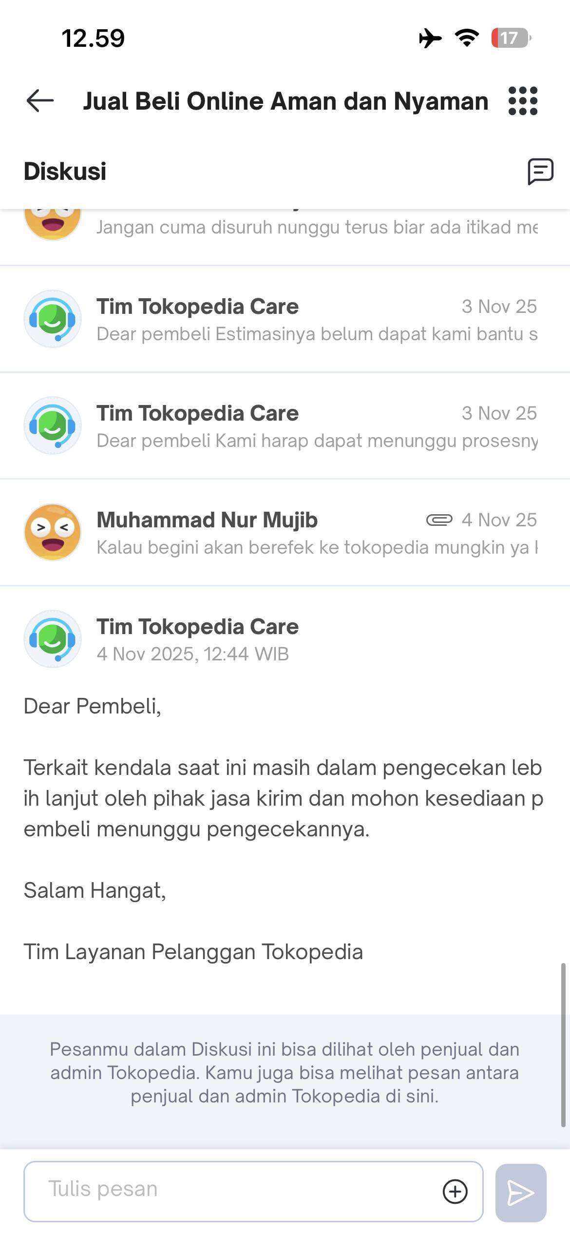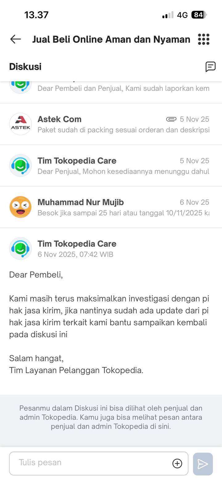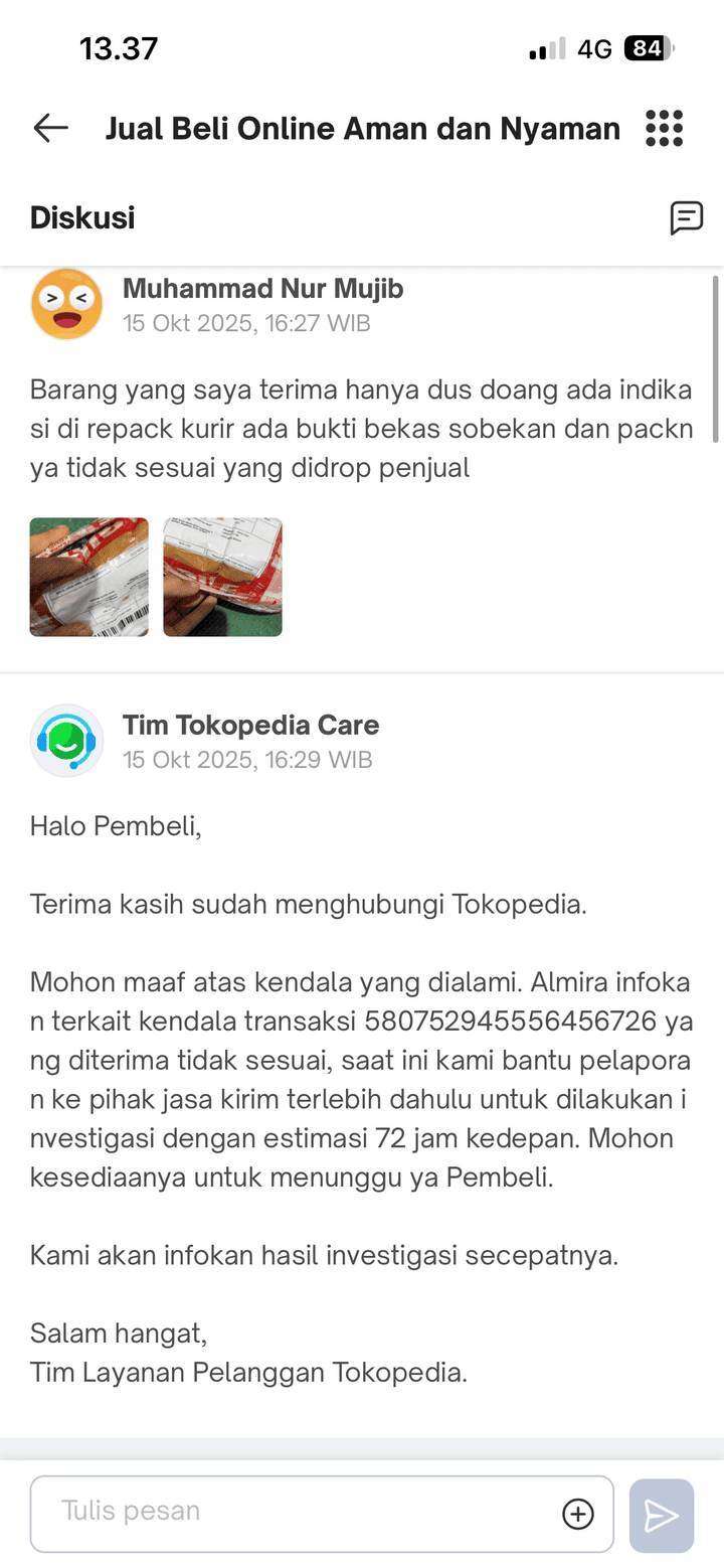 Kemudian, pada tanggal 15 Oktober 2025, saya segera mengajukan komplain ke Tokopedia. Saya diberitahu bahwa masalah ini akan diselesaikan dalam waktu 72 jam atau 3 hari kalender. Namun, waktu estimasi tersebut sudah terlewat hingga saat saya menulis surat ini pada 4 November 2025, masalah ini masih belum terselesaikan. Setiap kali saya menanyakan tentang masalah ini, jawaban yang saya terima hanya seperti jawaban bot, yaitu “Mohon maaf, masih dalam pengecekan pihak kurir dan ekspedisi.”