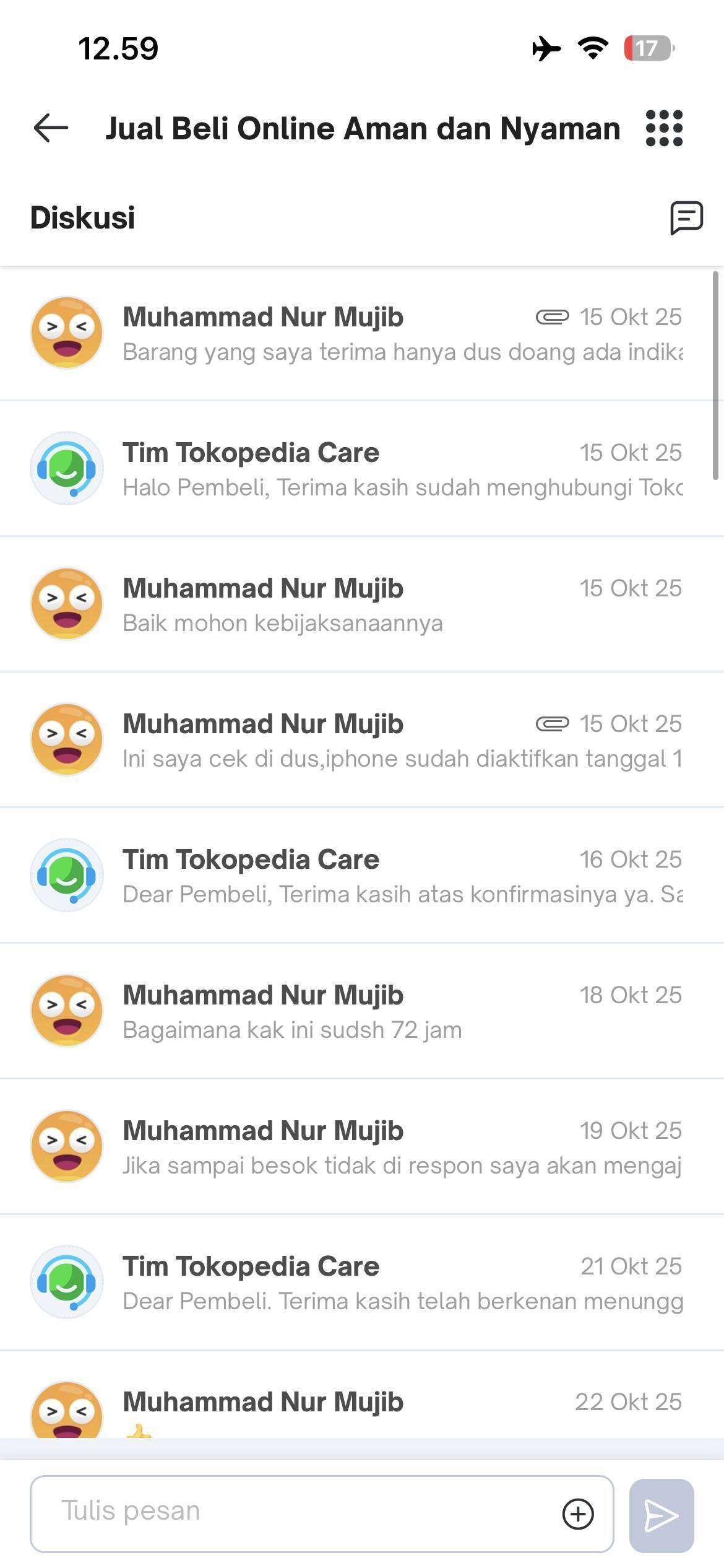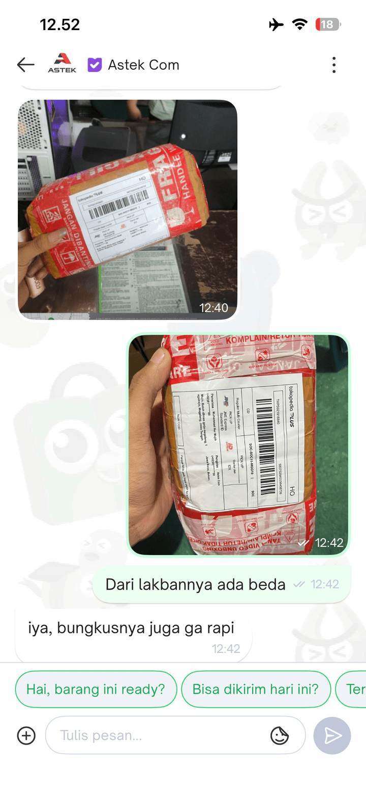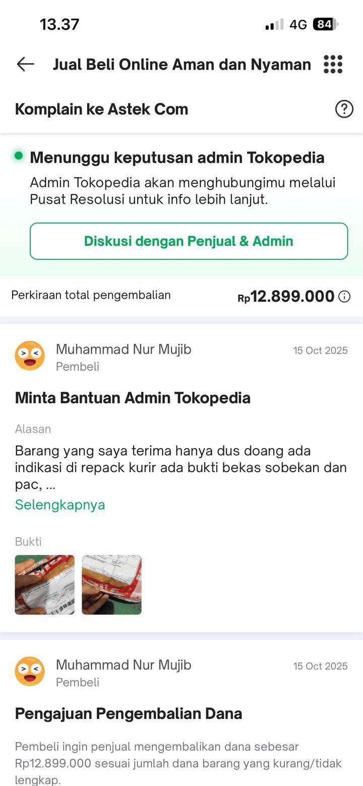 Kemudian, pada tanggal 15 Oktober 2025, saya segera mengajukan komplain ke Tokopedia. Saya diberitahu bahwa masalah ini akan diselesaikan dalam waktu 72 jam atau 3 hari kalender. Namun, waktu estimasi tersebut sudah terlewat hingga saat saya menulis surat ini pada 4 November 2025, masalah ini masih belum terselesaikan. Setiap kali saya menanyakan tentang masalah ini, jawaban yang saya terima hanya seperti jawaban bot, yaitu “Mohon maaf, masih dalam pengecekan pihak kurir dan ekspedisi.”