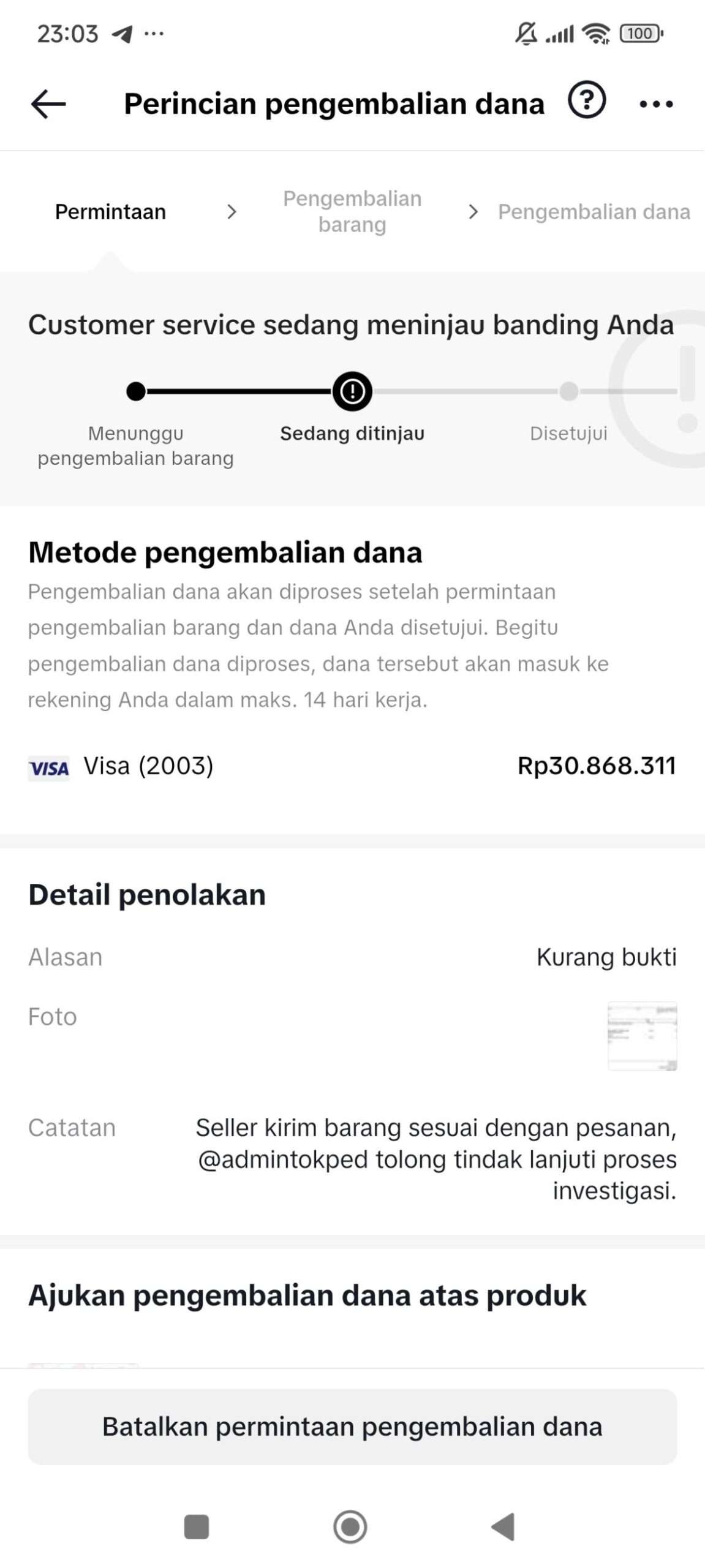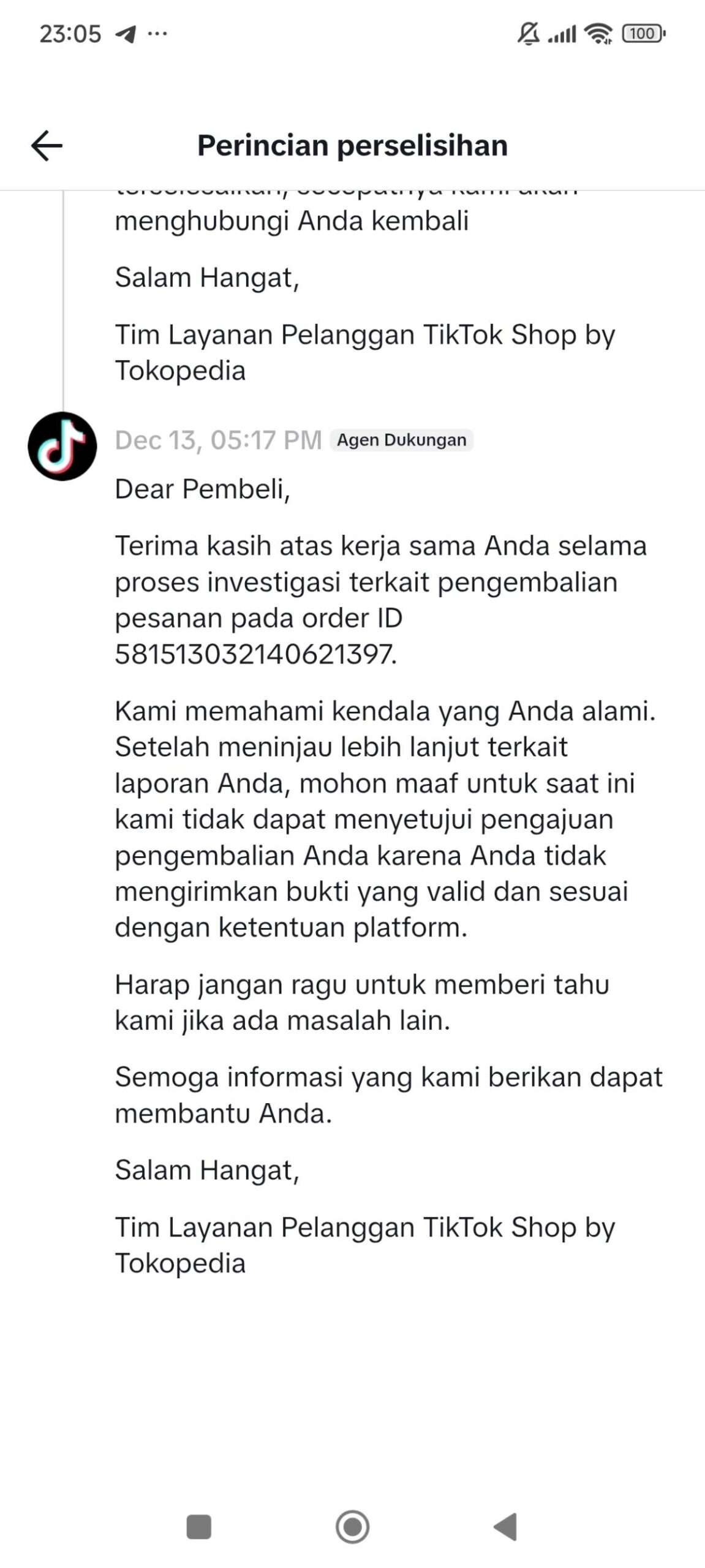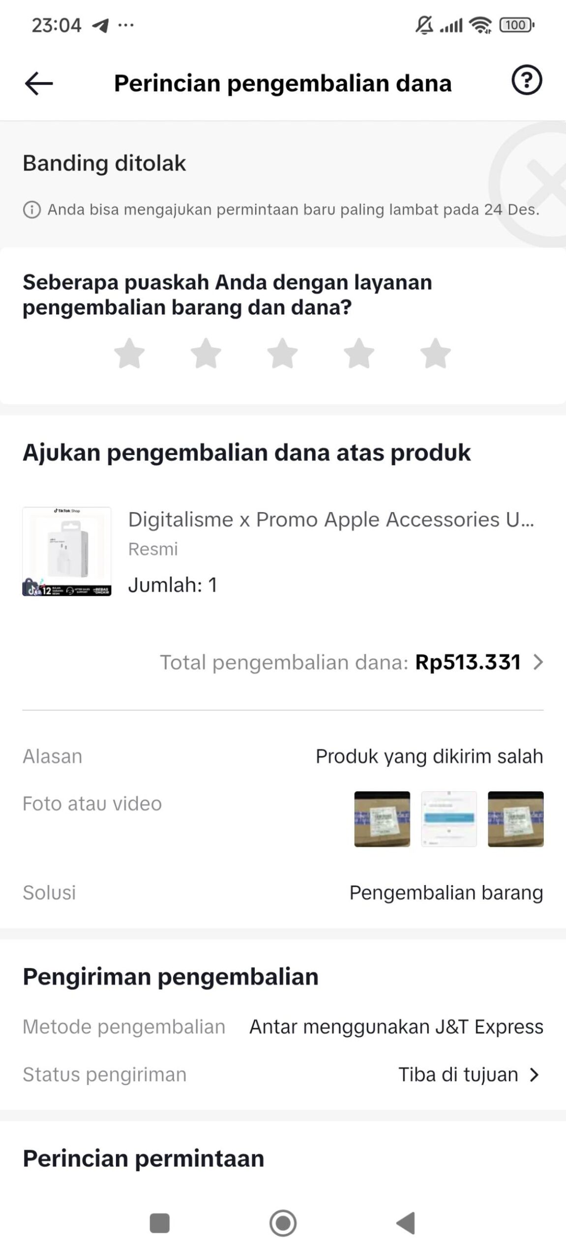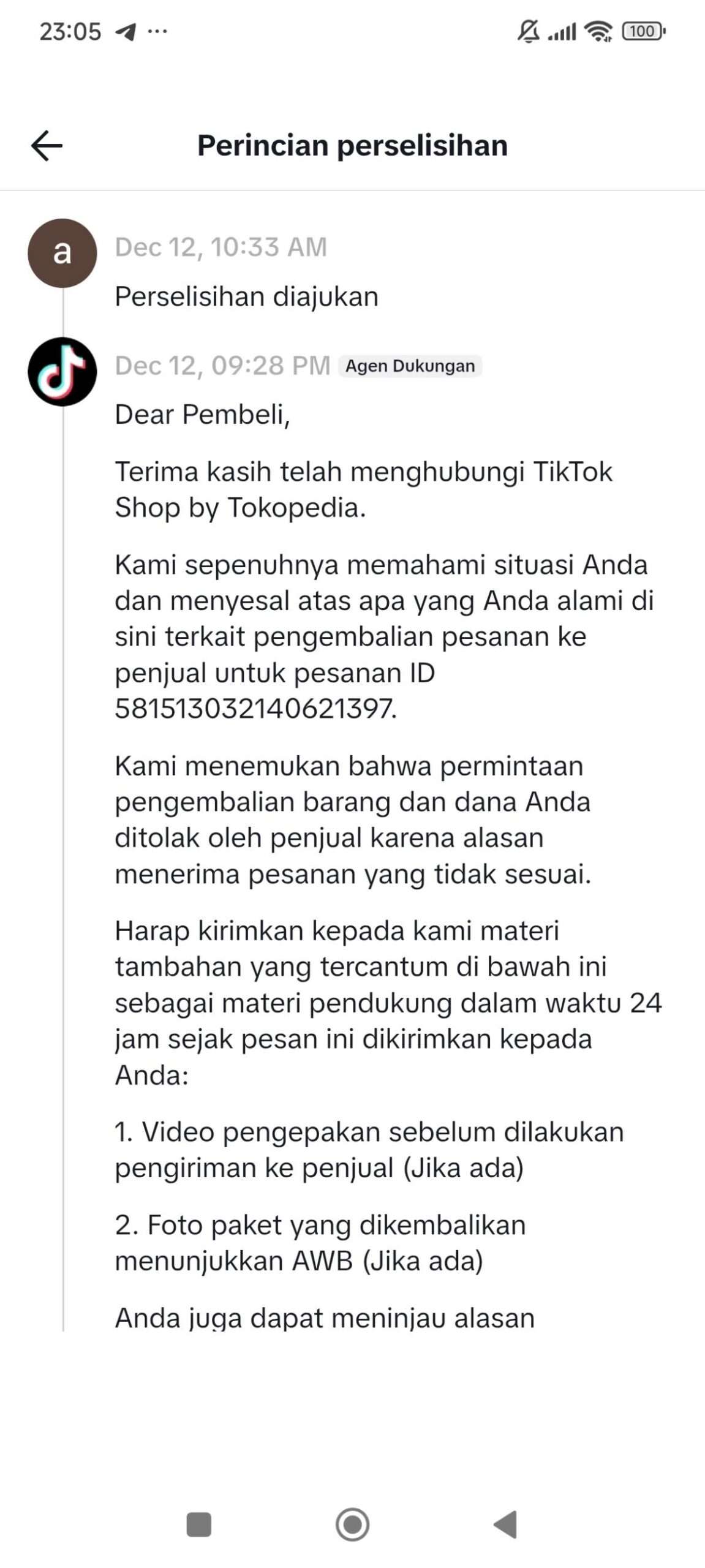 Saya mengajukan pengembalian dana dan langsung diminta untuk mengembalikan barang. Saya mengembalikan barang sesuai dengan yang saya terima, tetapi pengajuan tersebut ditolak oleh penjual dan ditinjau oleh TikTok Shop. Hingga akhirnya, tanpa kejelasan, permintaan saya tiba-tiba ditutup tanpa solusi.