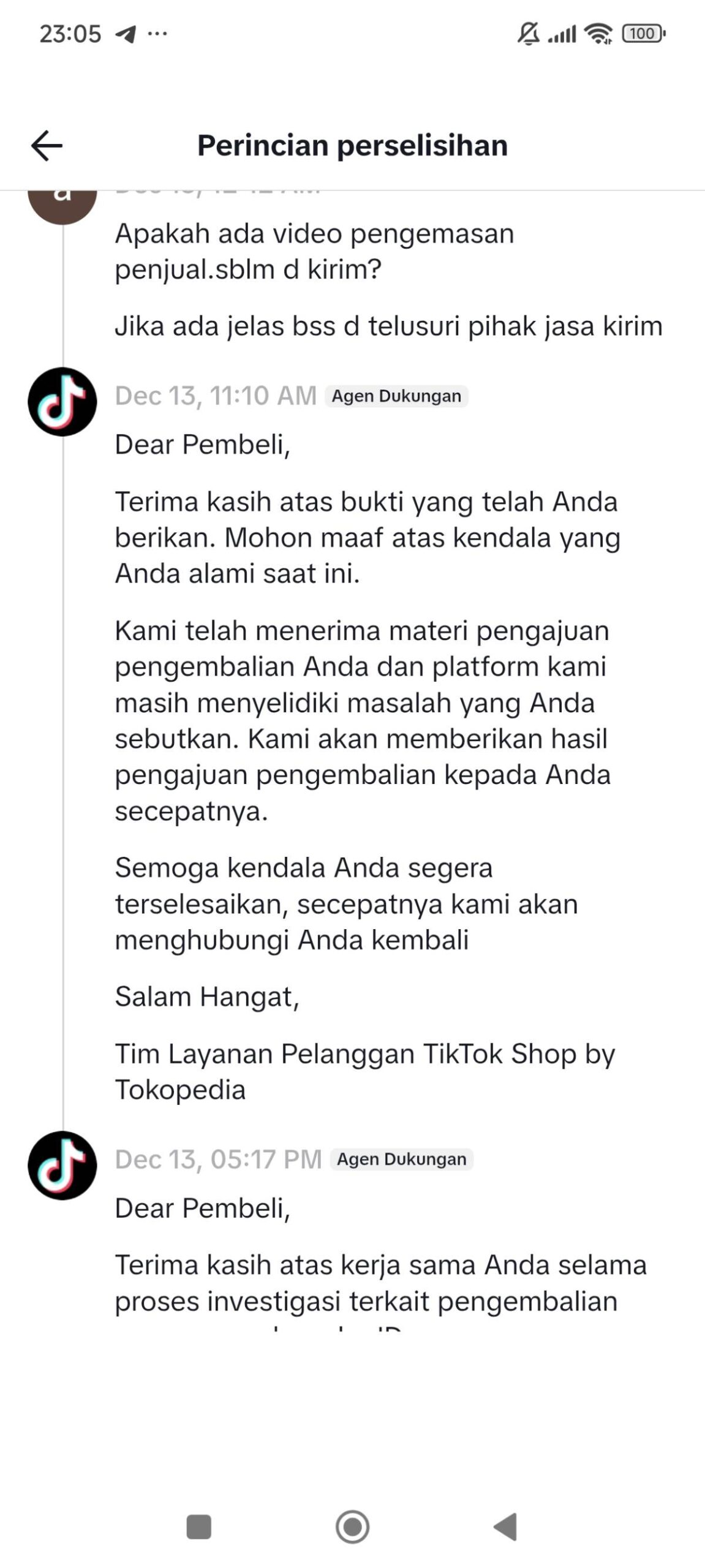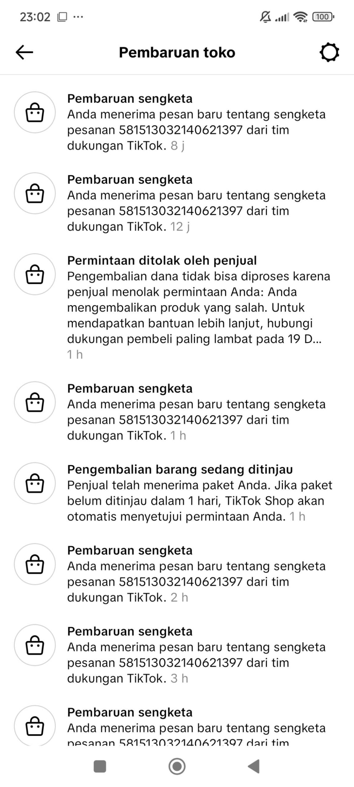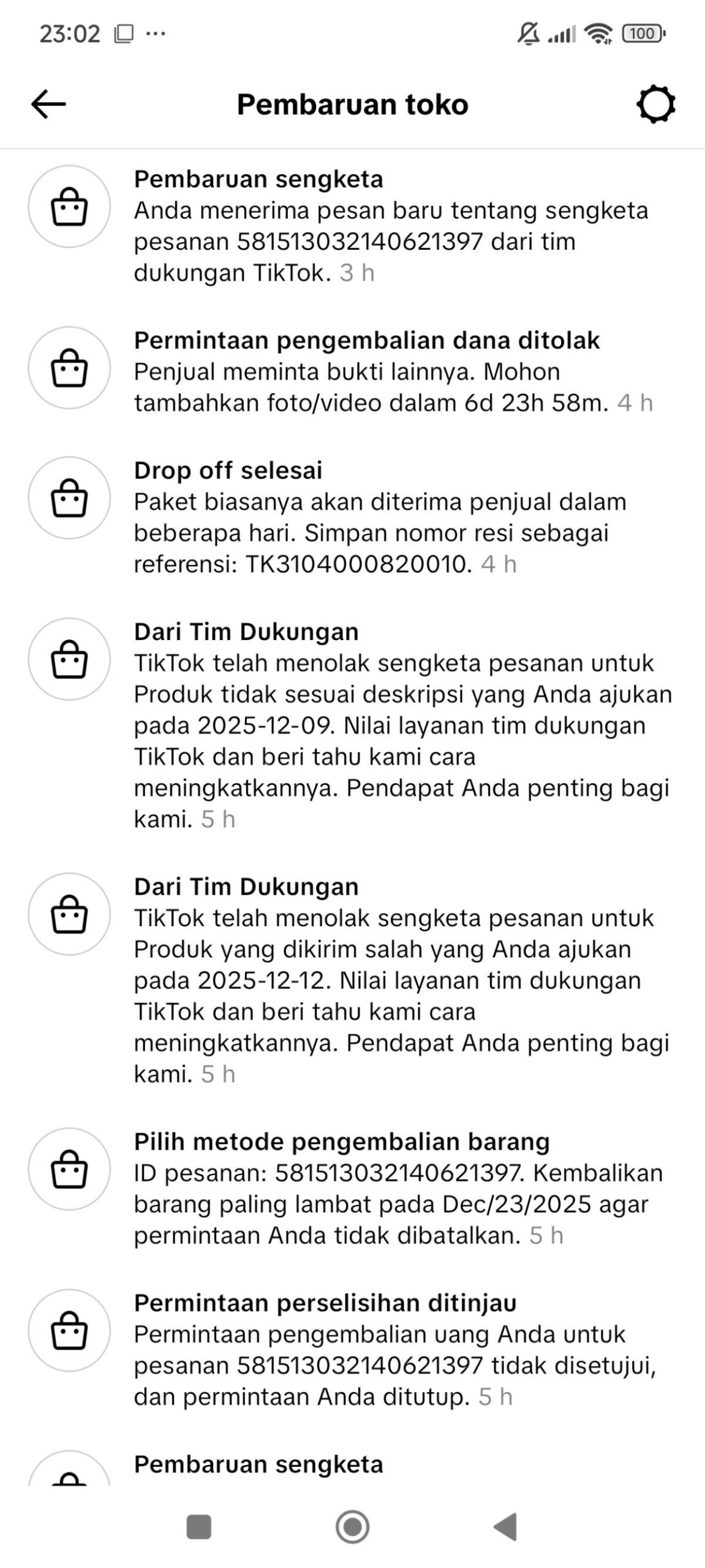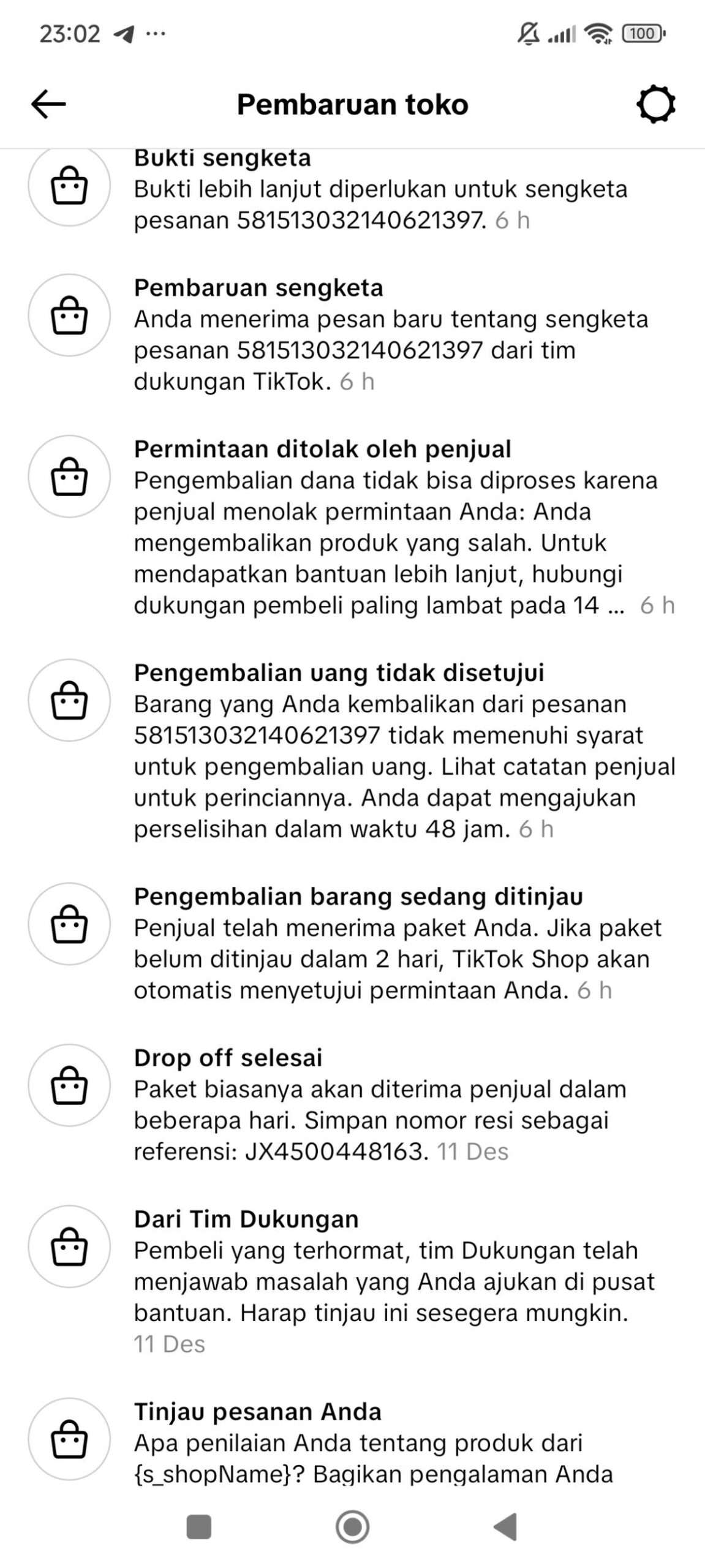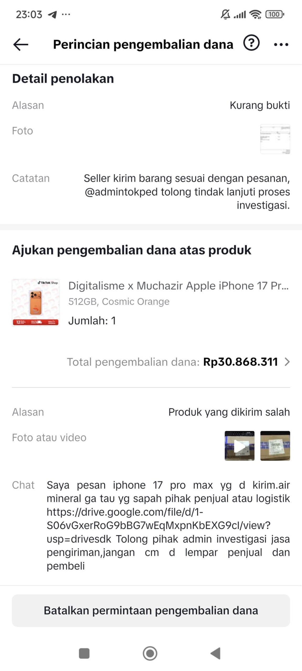 Saya mengajukan pengembalian dana dan langsung diminta untuk mengembalikan barang. Saya mengembalikan barang sesuai dengan yang saya terima, tetapi pengajuan tersebut ditolak oleh penjual dan ditinjau oleh TikTok Shop. Hingga akhirnya, tanpa kejelasan, permintaan saya tiba-tiba ditutup tanpa solusi.