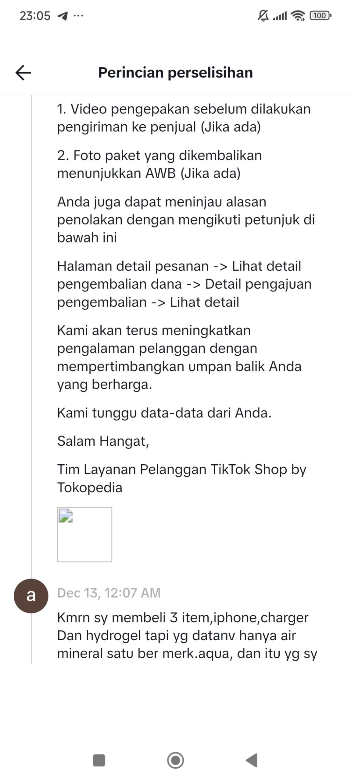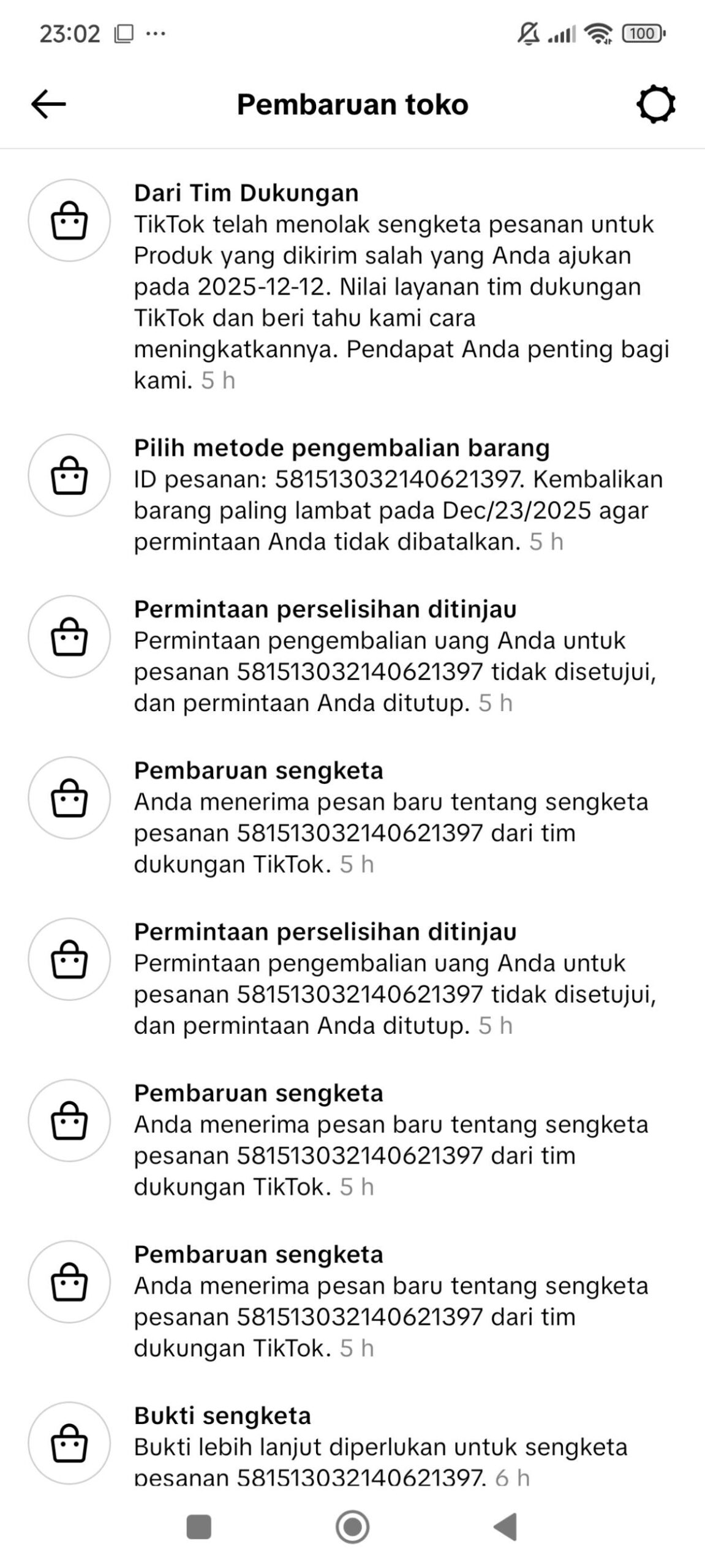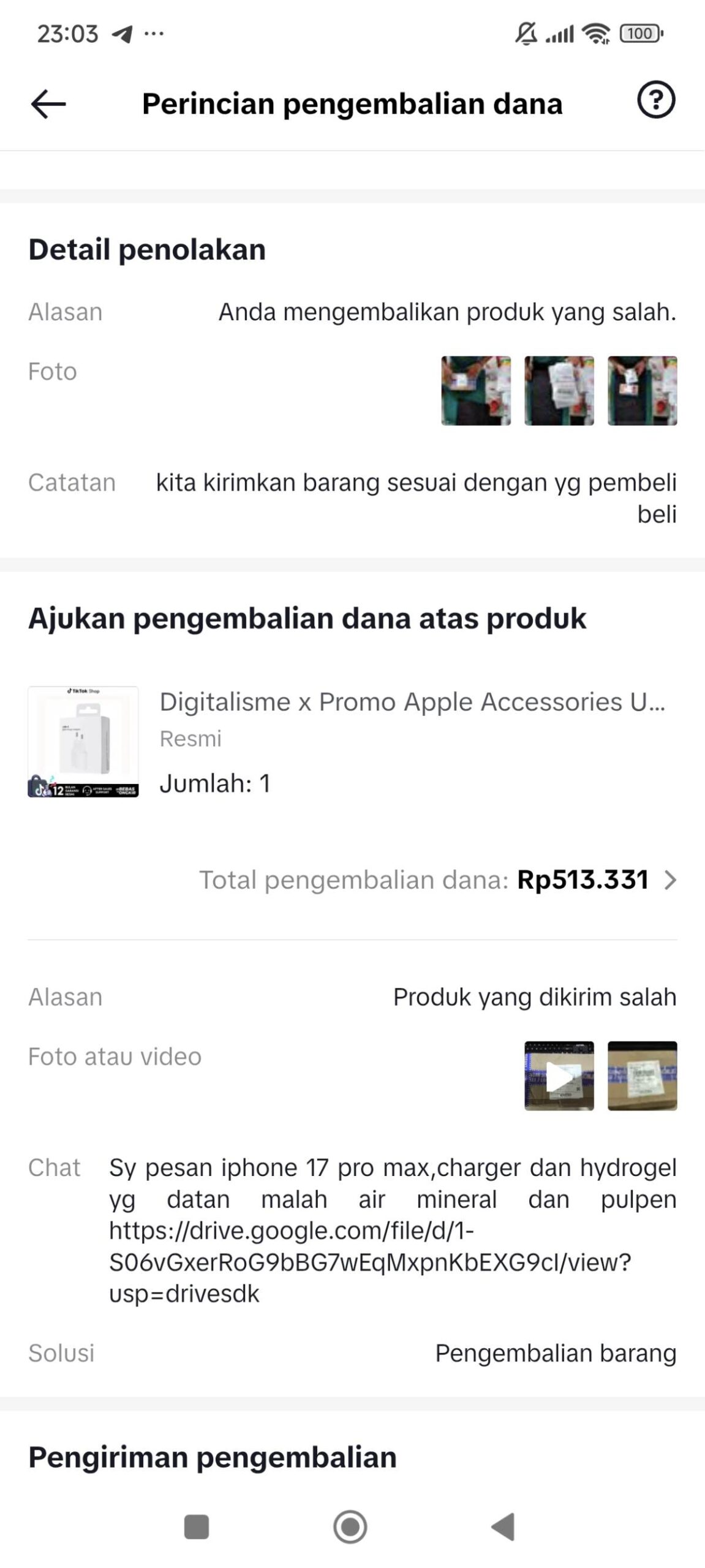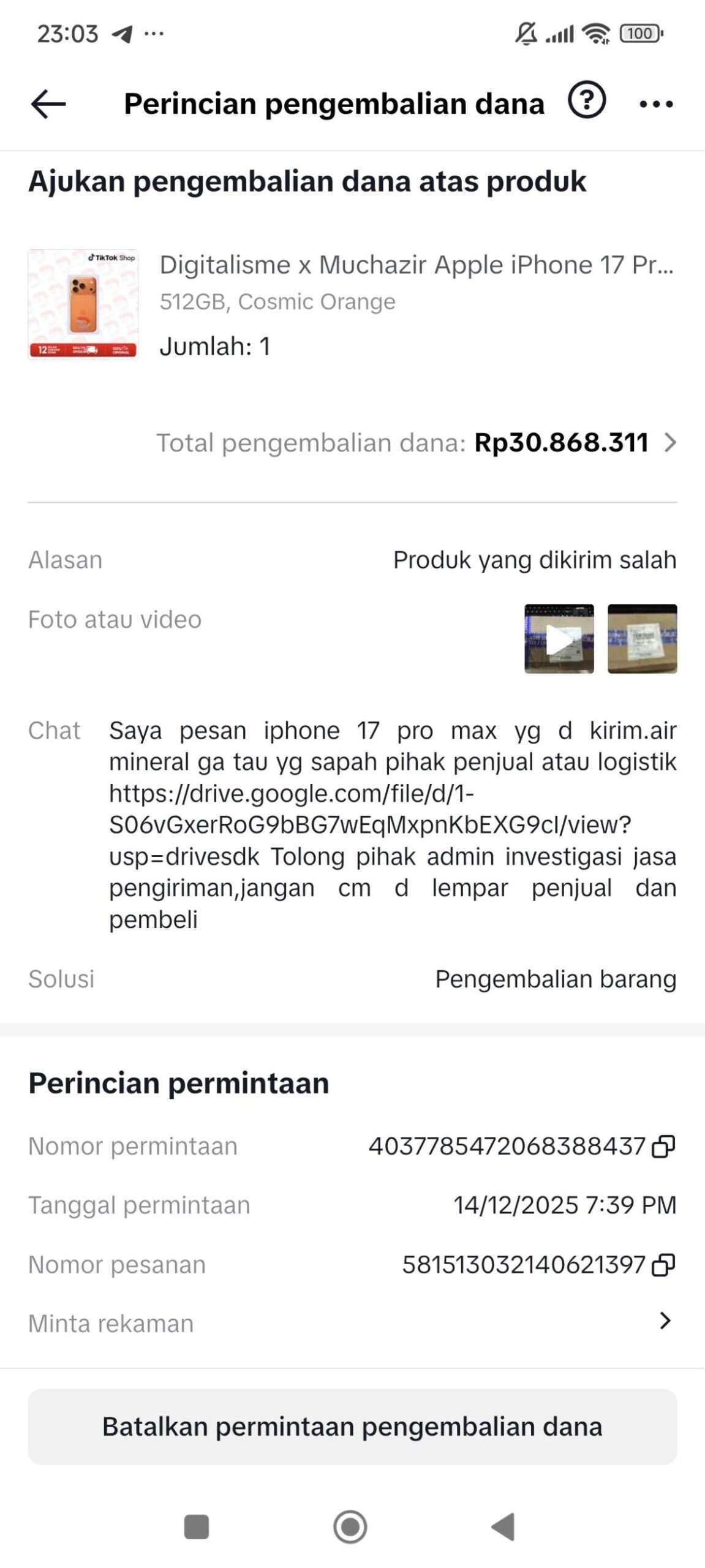 Saya mengajukan pengembalian dana dan langsung diminta untuk mengembalikan barang. Saya mengembalikan barang sesuai dengan yang saya terima, tetapi pengajuan tersebut ditolak oleh penjual dan ditinjau oleh TikTok Shop. Hingga akhirnya, tanpa kejelasan, permintaan saya tiba-tiba ditutup tanpa solusi.