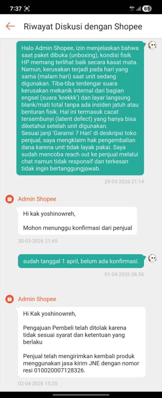 Kemudian saya diminta mengunggah bukti unboxing pada tanggal 30 Maret 2026, dan langsung saya unggah. Jawaban Shopee hanya meminta saya menunggu konfirmasi penjual paling lambat 31 Maret 2026. Namun hingga tanggal 1 April saya belum menerima informasi apa pun. Hingga akhirnya pada tanggal 2 April, pengajuan saya ditolak dengan alasan tidak sesuai syarat dan ketentuan, serta penjual diklaim telah memberikan bukti kuat yang tidak bisa saya lihat.