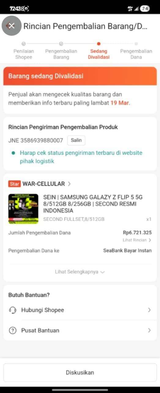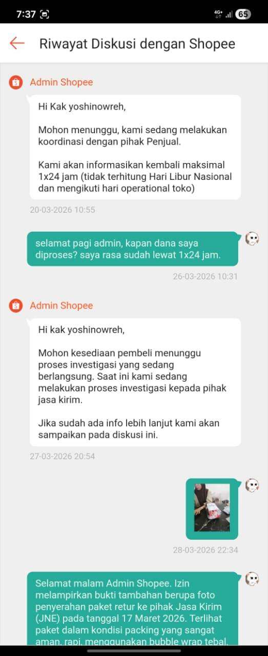 Saya segera mengirimkan barang kembali ke penjual dengan kemasan serapi saat saya menerimanya, menggunakan biaya pribadi. Barang tiba pada tanggal 17 Maret 2026 dan saya diminta menunggu konfirmasi penjual hingga tanggal 19 Maret 2026 (foto terlampir). Namun hingga tanggal 26 Maret 2026, status belum berubah dengan alasan hari libur nasional, hari operasional toko, dan investigasi jasa kirim.