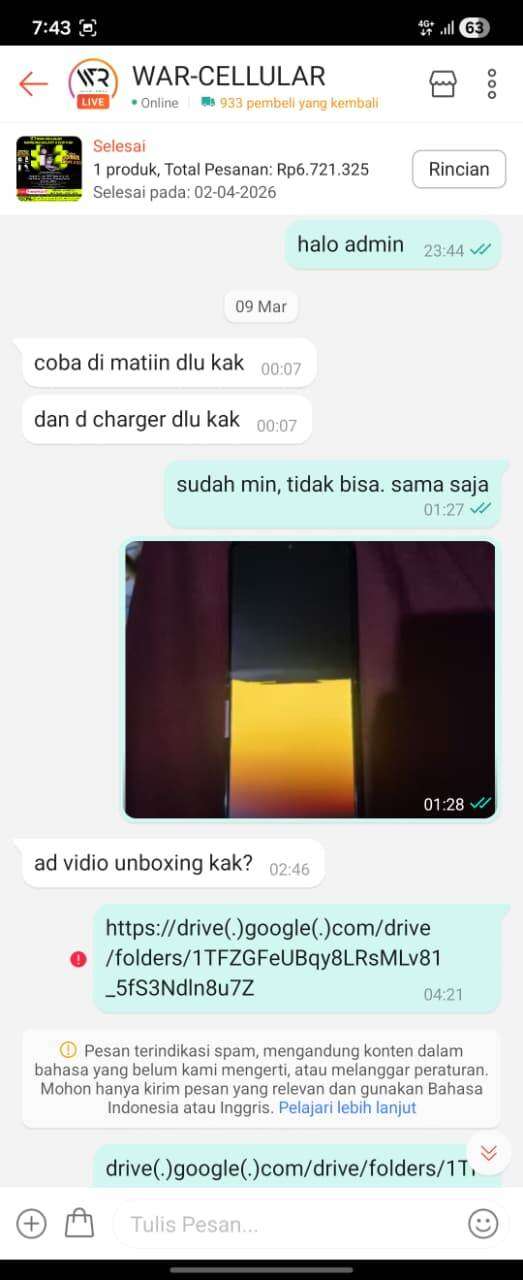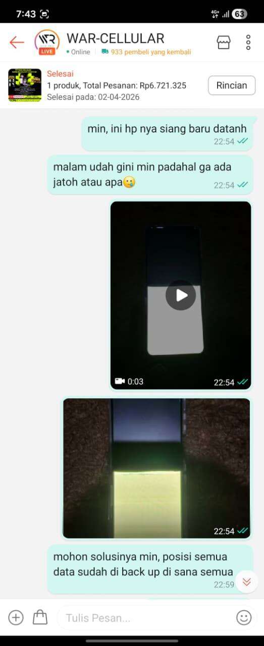 Barang sempat tertahan dan akhirnya tiba pada tanggal 8 Maret 2026. Saya melakukan unboxing dan handphone terlihat normal dan baik-baik saja. Karena ini adalah handphone impian saya, saya pun memegangnya dengan sangat hati-hati. Namun pada malam harinya, ketika saya ingin membuka handphone tersebut, terdengar suara “krek” yang sangat nyaring dan layar langsung mati total (foto terlampir). Handphone sama sekali tidak pernah jatuh, tidak terkena air, maupun hal lainnya. Dalam kurun waktu dari siang hingga malam, saya hanya membuka handphone tersebut kurang lebih 5 kali.